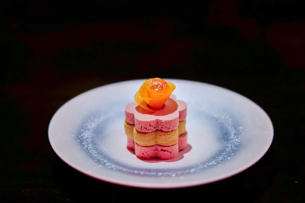 Seals «Kiss from a Rose» spilles når neste rett serveres. En vakker og svært velsmakende konstruksjon med en gyllen rose laget av jicama smaksatt av safran. Det er pistasj her og andre herligheter. Jeg elsker den.