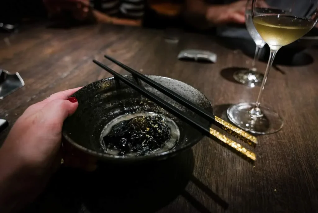Denne kullsorte retten med nudler og svinekraft er en fryd å spise. Dekadent og velbalansert på alle måter. Til denne retten har vi også fått velge vårt «våpen» – spisepinner rangert fra kongelige til vanlige folk. Tror jeg benyttet sjansen til å være kongelig for en kveld.