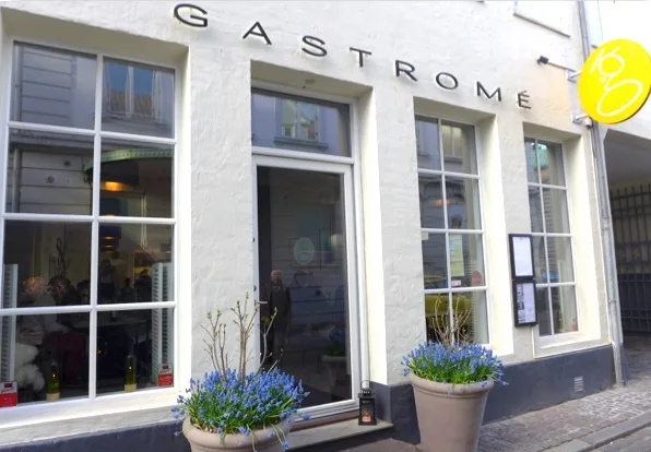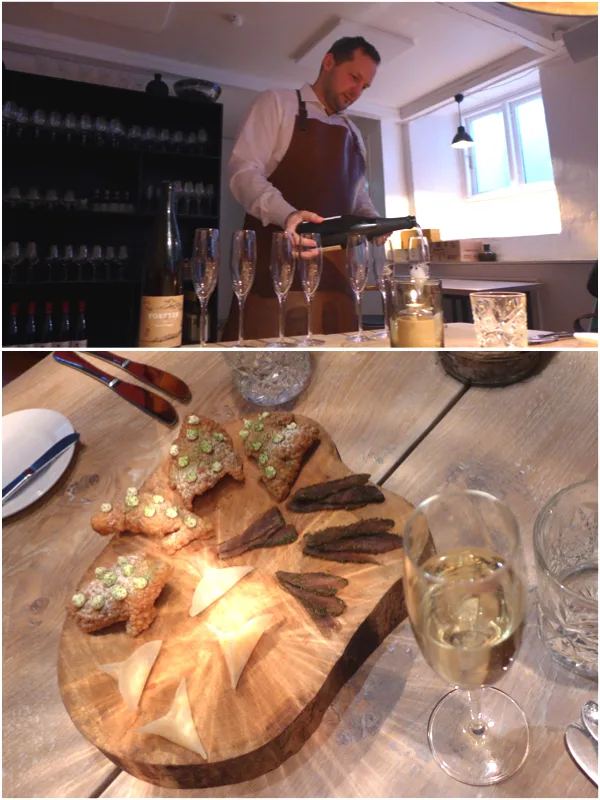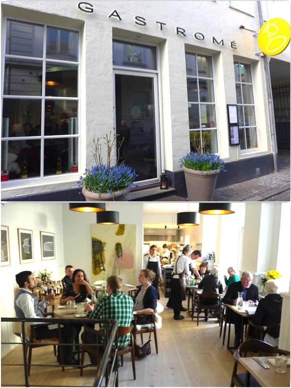 Snacks: Syltet glasskål med torsketartar rørt med sjøkreps-mayo og pepperrot.Gravet lammemørbrad med tørket dill Tapioka-chips med hjemmelaget friskostcreme og dill. Dette ble servert med en økologisk cremant.Amuse: Vannbakkelse (ser ut som stein) med stenbitrogn fra Østerjsøen, økologisk fåremelksyouhurt + purreløk. Brød med purre, fennikel og potet. Purreløkskrem og dobbelt-smør: Nypisket smør tilsatt nøttesmør. Hurra o’ lykke!1. rett: Kamskjell. Kamskjell-ceviche med druevinagrette, karseemulsion, jordskokk, brønnkarse og skovsyrer. Drikke: Domaine Luneau Papin, økologisk dyrket.2. rett: Torsk. Skinnstekt torsk fra vesterhavet/nordsjøen ligger på en grytestekt blomkål stekt i brusende smør, blomkålspure, blomkålscrudete med ebleeddik. Dertil bisque på danske strandkrabber. Hus Drikke Green Duck the duchess fra Avondale – navnet kommer af de økologiske vinmarker, hvor ender går rundt og spiser sneglene som ikke er gode for vinstokkeneKoselig stemning hos Gastromé.3. rett: Brissel. Kalvebrissel – først sprengt så konfiteret og så friteret, med skorzonerot stekt i sitronsmør, smørsorterte ramsløk fra Riisskoven (Det var der jeg var på ramsløksplukking. Se her!) + ramsløkolje & ramsløkstøv. Hvite stemorsblomster/ramsløksblomster. Syltede perleløk og skummende løkcreme som saus. Drikke: Paul Ginglinger, Cuve les prelass, Pinot Gris4. rett: Lam. Rosastekt lammefilet fra dansk vadehavslam = marsklam, braisseret lammekjaker, mild hvidløgspure,potetfandant (i andefett) i potetjord, dampede boiritaneløg, skvalderkål fra Vilhelmsborg + lammesaus laget på de braisserede kjakene. Drikke: Sa Natura, Celler Pinol. Helt fantastisk vin!5. rett: Ost. 8 forskjellige nordiske oster Drikke: Munkebo-øl – Valhal: Grannåle, grape og limesmak/ Alstærk: 7 forskellige mørke malt-sorter.6. rett: Potet. Imiteret mokkais, høybakt mandelpotetl, potetmarengs drysset med nellik + saltet karamelsaus. Drikke: Dom Brial , Grenache Blanc og Macabeo Område Baixas, Rousillon7. rett: Sjokolade. Bitter sjokoladegarnache-is på kråebolle, honning og sjokoladecouli, kakaochips og kakao-honningknas og kakaosten. Drike: Mas Amiel, Maury, LanguedocSmågodt til kaffen. Nå klarer jeg rett og slett ikke mer mat. Du får mye for pengene hos Gastromé. Fantastisk drikkemeny og utsøkte retter.Takk for i aften, Søren!