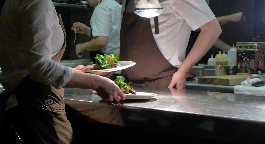 Stedet er stappfult en lørdags kveld, noe vi hadde regnet med, men vi får plass i baren sammen med Nicolai – kjøkkensjefen på Det Kongelige Slott. Både Erik og jeg kjenner ham litt fra før, så det er bare superhyggelig å sitte sammen med ham.