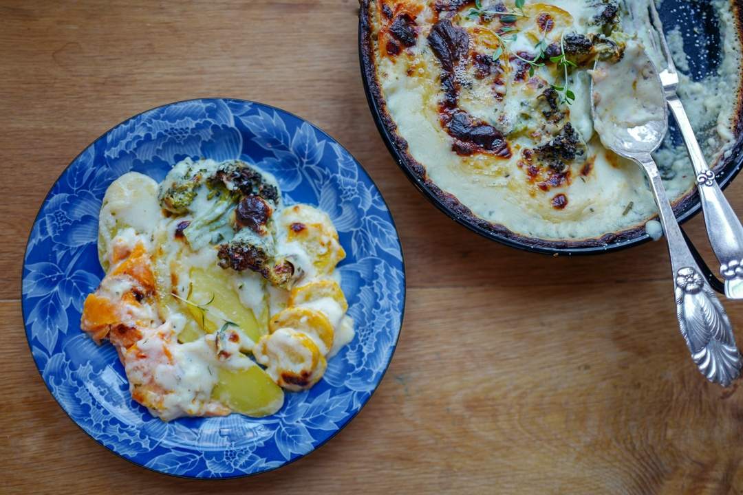Å lage gratinerte grønnsaker er superenkelt. Det som er det kritiske punktet er å lage bechamel-sausen. Du vet, en slik du bruker når du lager lasagne. Du kan selvsagt bruke fløte og så trenger du ikke bekymre deg, men jeg hadde ikke fløte og dessuten synes jeg konsistensen på en bechamel er så deilig.