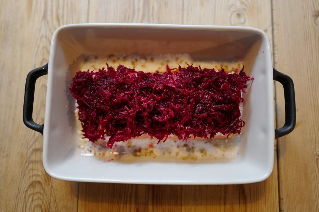 Jeg brukte også 1 god neven revet, rå rødbete for å gi fin og julefarget kant til laksen. Det gir også en deilig smak til fisken.