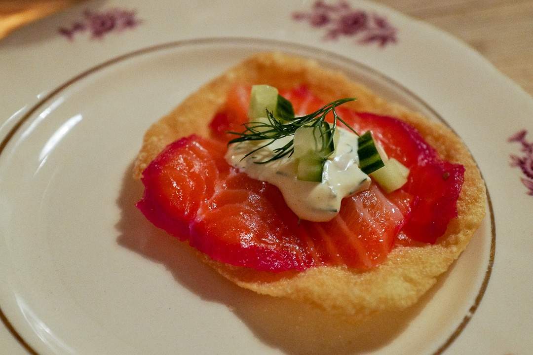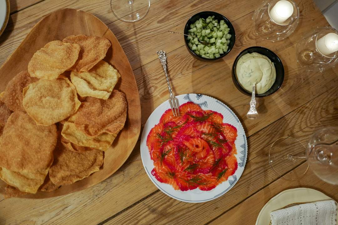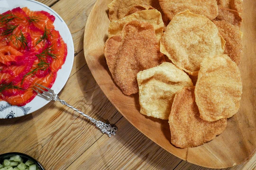Jeg serverer gravlaksen som forrett på en «forsyn-deg-selv-måte» med frityrstekte wonton-brød. Det er enkelt. Du kjøper wonton-plater fra asiatisk butikk eller større supermarkeder. Tin dem og friter en og en plate i nøytral olje til de er sprø. Legg dem over på tørkepapir for å renne av oljen.