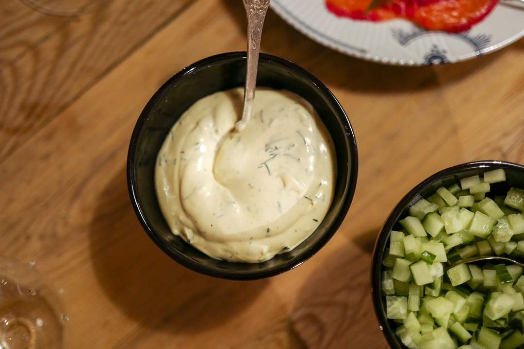 Jeg lager en enkel dressing av rørosrømme (den er syrlig og deilig i smaken og passer godt til dette) og masse dijonsennep, hakket dill og en skvis sitronsaft. Smak til med pepper og sørg for at dressingen har litt kick, for gravlaksen er mild og søt.