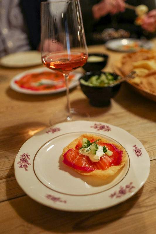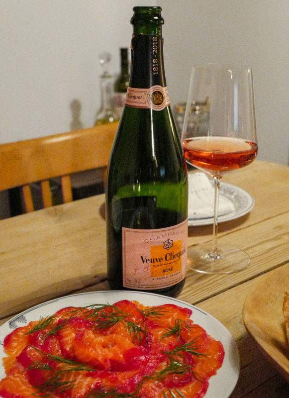 Igjen har jeg tatt frem Champagne-flasken. Rosa champagne til rosa fisk er den perfekte kombinasjonen. Veuve Clicquot Brut Rosé er laget på Chardonnay, Pinot Noir og Pinot Meunier. Den er mild, fruktig og frisk og er helt perfekt til den fete fisken og den lett spicy dressingen. Prøv det!