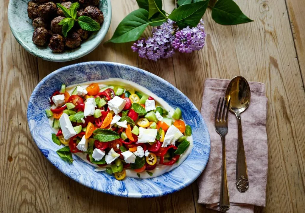 Dette er ingen ekte gresk salat, men den har mange av de samme elementene. For det første har jeg laget en yoghurtkrem med tahini og sitron som jeg har smurt i bunnen som en tykk dressing. Det smaker altså så godt og den passer så godt til både salaten og de gresk-inspirerte kjøttbollene som min mann lagde. Han er kjøttbollemesteren her i huset og du kan lage hans fluffy kjøttboller her.