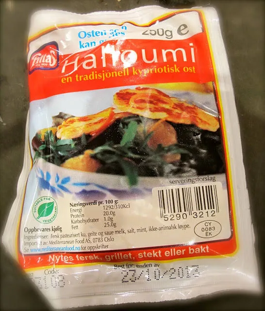 Haloumi er en kypriotisk mild ost laget av geitemelk. Den egner seg perfekt til steking eller grilling. Du kan vende den i egg og mel og steke den i pannen for å få en krisp hinne, eller du kan legge den på grillen etter at du har skåret den i skiver. Den er ganske salt og har litt gummikonsistens, men jeg liker den godt som et alternativ til kjøtt eller fisk.