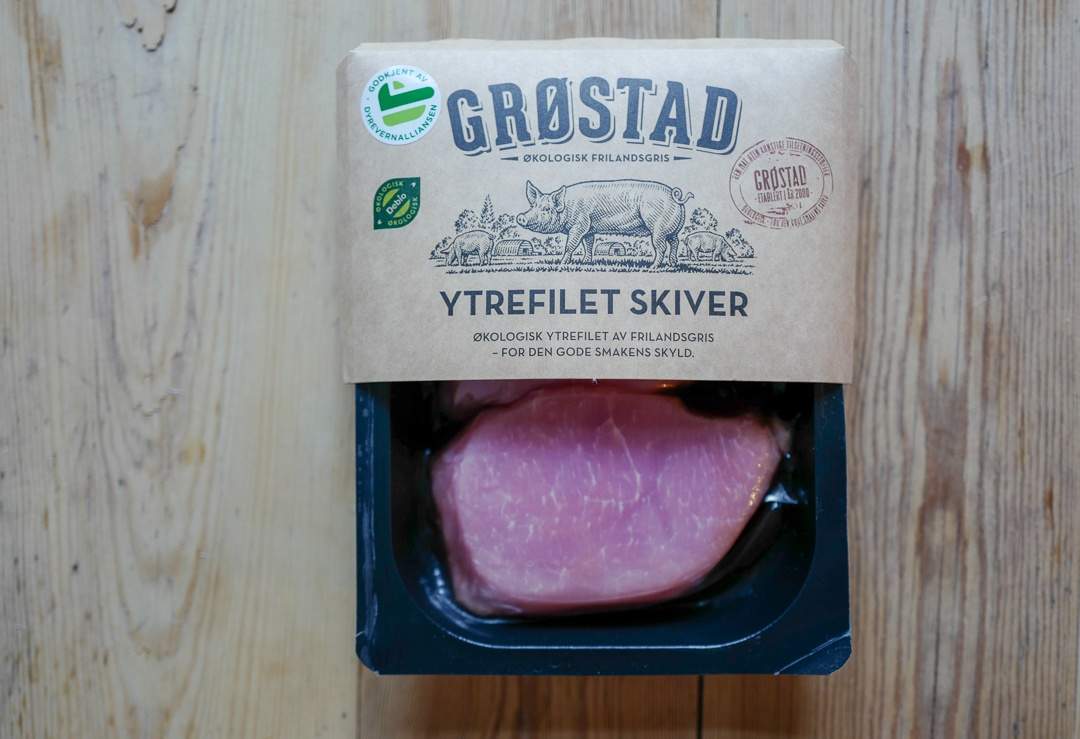 Jeg bruker ytrefilet av svin fra Grøstadgris. Dette er økologisk svinekjøtt av frilandsgris med dyrevernsmerket «God dyrevelferd» som beviser at dyrene har hatt det godt. Det er viktig for meg.