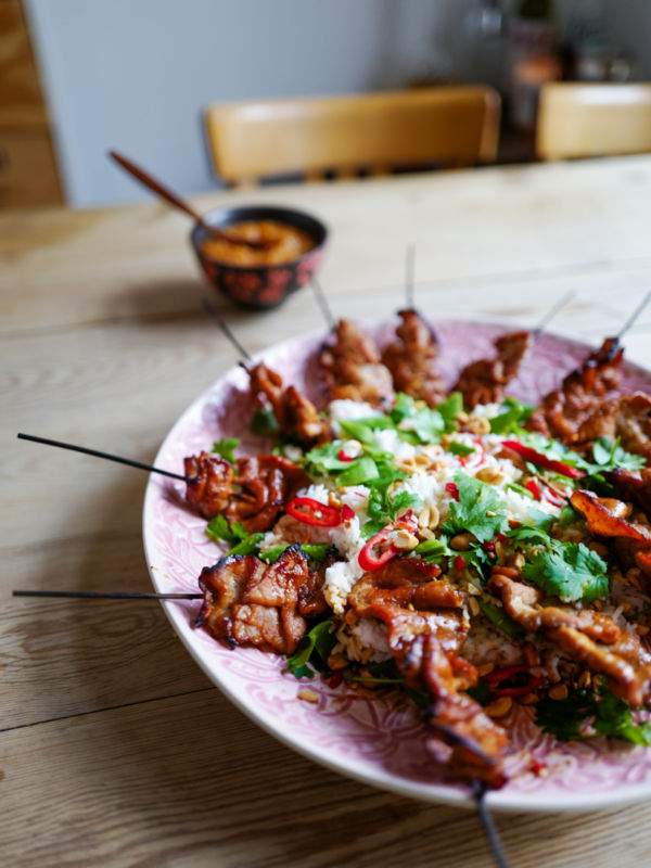 - Vask risen flere ganger til vannet er klart. Tilsett kokosmelk og vann og kok risen på vanlig måte med litt salt. Når risen er ferdig blander du den med peanøtter, sesamolje, chili, sukkererter, vårløk og masse koriander. Legg spydene på toppen og server.