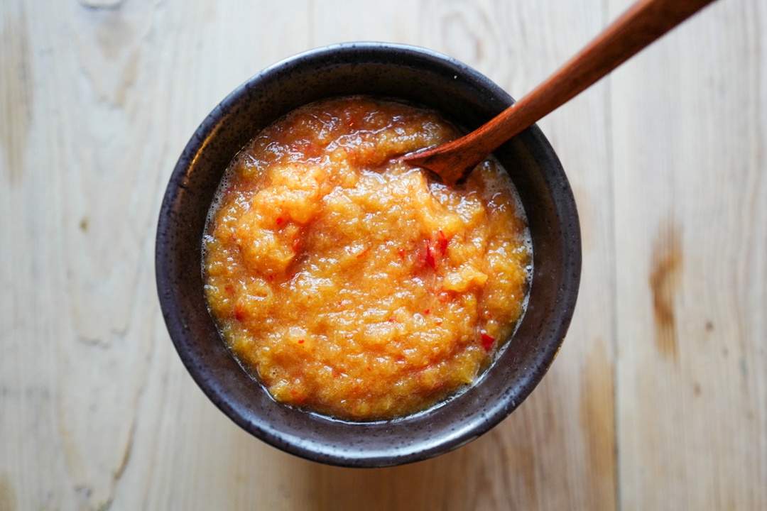 - Ananaschutney: Skjær ananasen i terninger (fjern skall og stammen) og kok opp sammen sukker, eddik, chili, ingefær og 1 dl vann til ananasbitene er møre. (Ca 15 minutter). Kjør med stavmikser, men ikke glatt. Det er bare godt med noen chunks i chutneyen. Avkjøl og server til. Denne er perfekt å lage dagen før bruk.