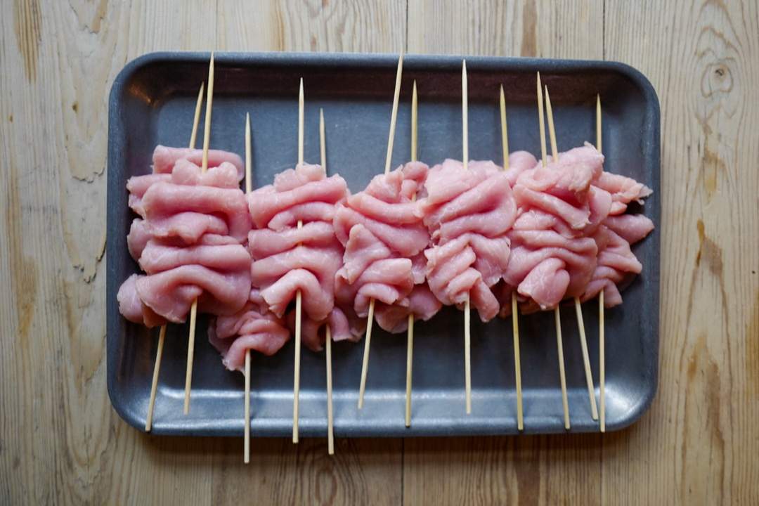 - Skjær svinefiletene i tynne skiver. Gni dem tynnere med siden på et knivblad. Tre på spyd i trekkspillform.