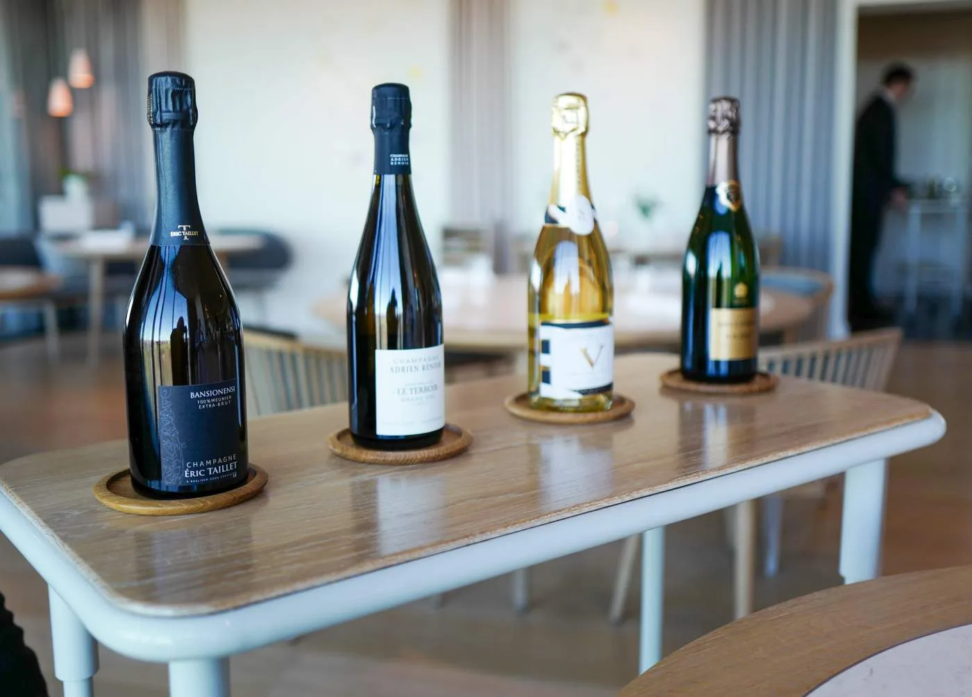 Først får vi tilbud om et glass champagne. Det er aldri med i prisen, men er en god idé å drikke til snacksen som serveres først.