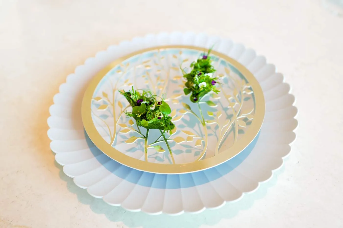 Første rett kalles “Danske tradisjoner” Salt sild, dillstilker og akevitt pakket inn i sprø alger er den perfekte starten på måltidet. En liten snack som man spiser med fingrene og som eksploderer av frisk smak i munnen. Paret med champagnen kan man smake hylleblomst. Denne starten synger av årstiden som vi trer inn i. Frisk, lysegrønn og full av håp.