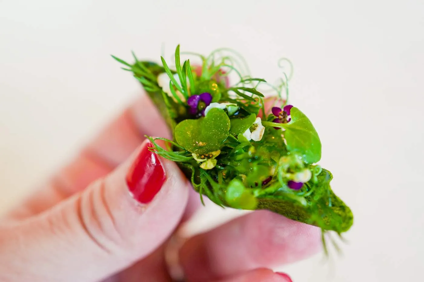 Neste rett er vakker som en vårdag, men litt vanskelig å spise. En “kornaks” er bunnet opp med en spiselig blomst og strødd med en skarp og deilig Kornly-ost og en lett bitter kornkaffe. Bitterheten gir nok en smaksopplevelse selv om kornaksen brekker i et forsøk på å spise den pent.