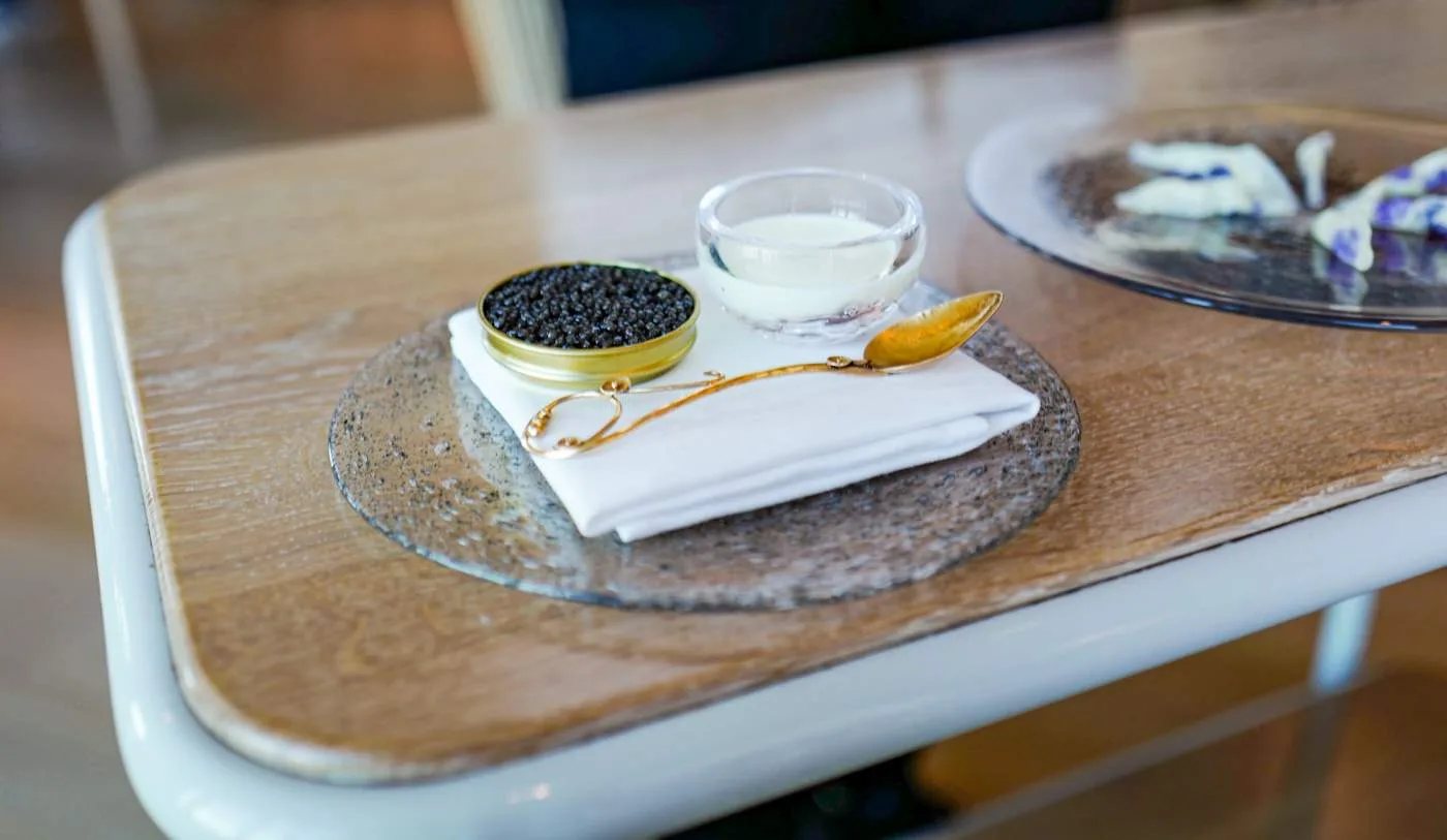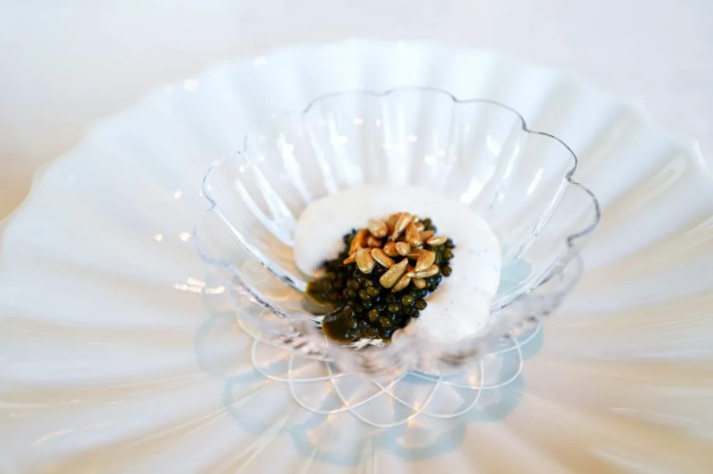 “Gold” Osetra kaviar fra Bulgaria toppet med lettrøkte, gullfargede solsikkekjerner, syltede valnøttblader og krem serveres i en gjennomsiktig glasskål fra Geraniums nye service i japansk stil. En minimalistisk blonde ligger mellom skålen og tallerken og gir et fantastisk skyggespill.