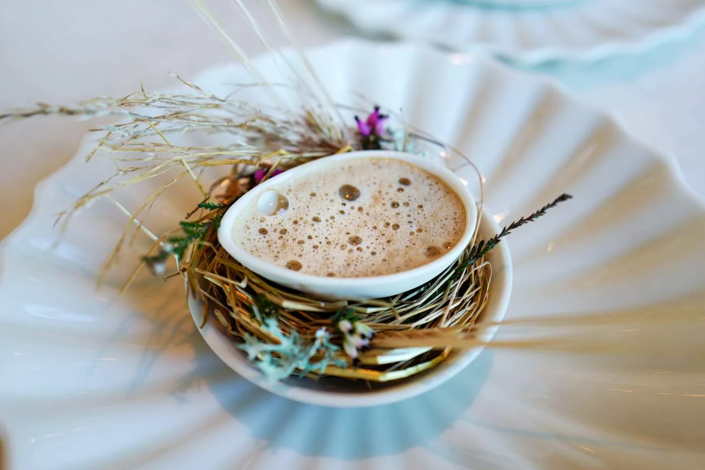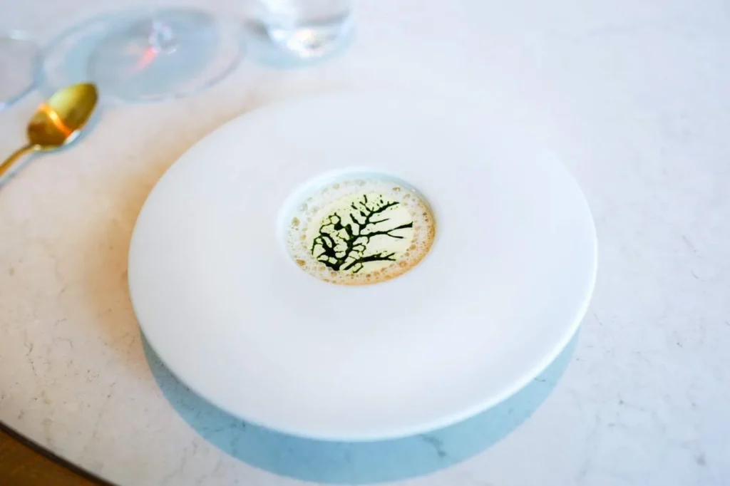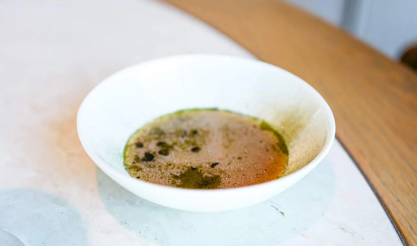 Rasmus Kofoed heller neste rett i en liten bolle ved bordet og forteller at det er en infusjon av grillet blekksprut, gjærflak og potetskrell. Jeg opplever dette som en veldig trøstende og beroligende drikk som man kan relatere til en japansk teseremoni eller en bolle med styrkende dashi. En veloverveid og klok rett som man drikker fra bollen.