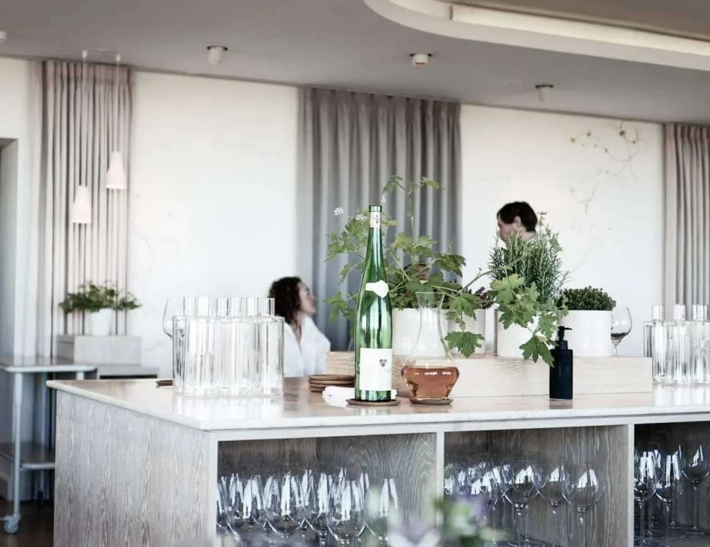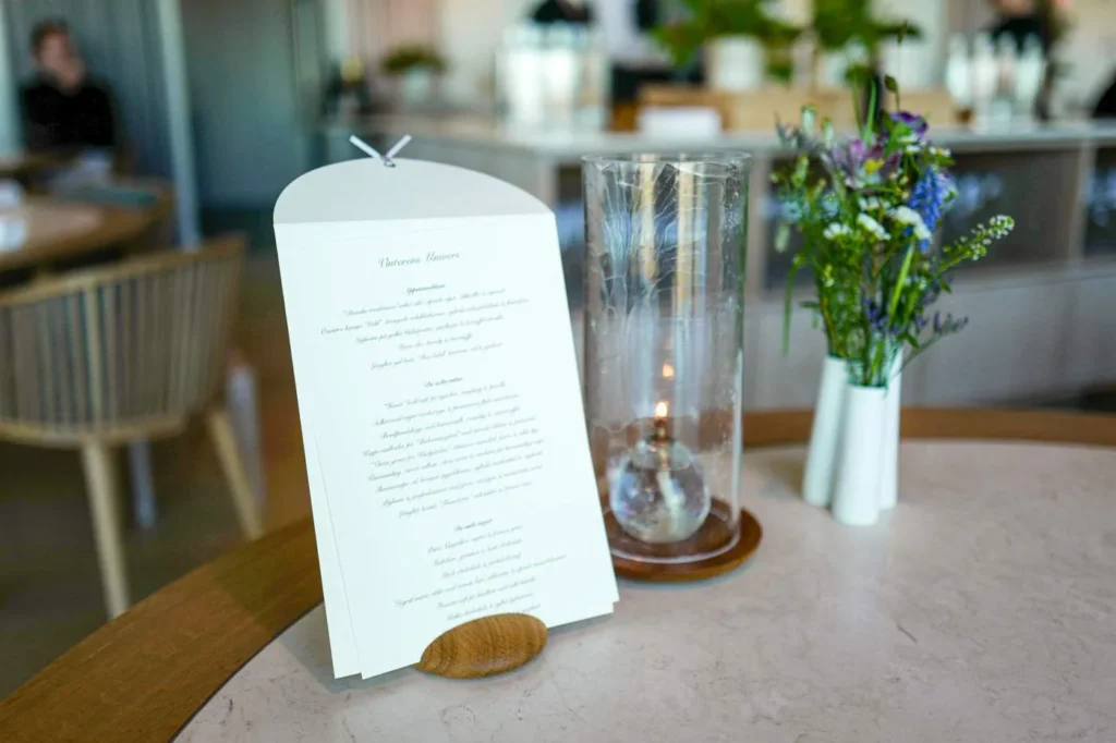 Lokalet har diskret stensiler på vinduene med abstrakt blomstermotiv. Også på veggene er det malt blomster og grener, humler og bier. Disse tegningen er helt nye og glir godt inn i den nordiske og lyse stilen i restauranten.