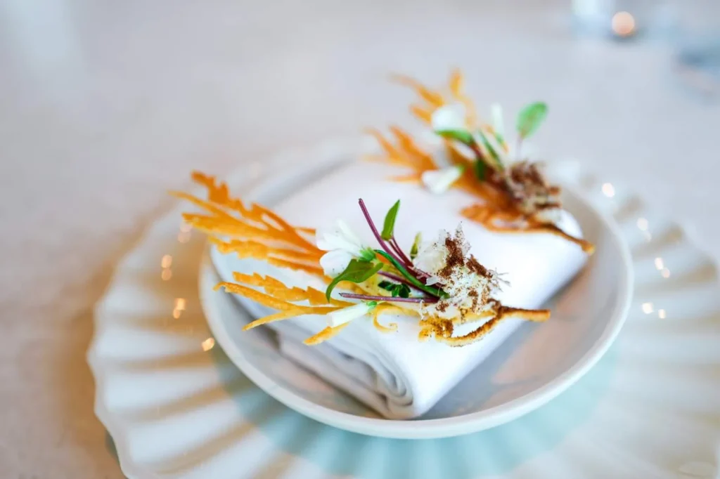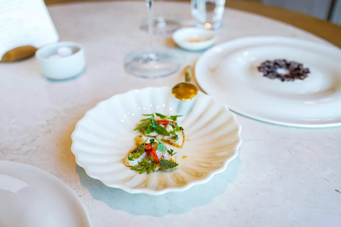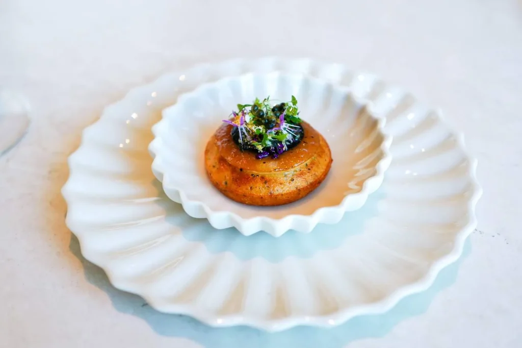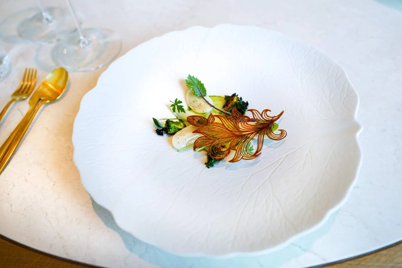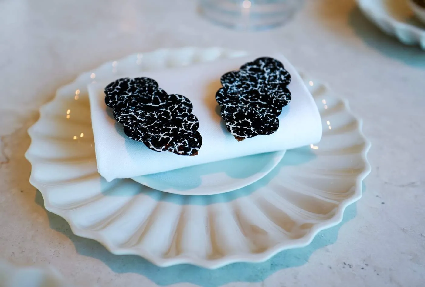 Siste saltrett er nok en billedskjønn rett. Enkel, men proppfull av umami. Under den vakre og dekorerte disken ligger lettsyltet kvede med bianchetto-trøffel (mildere enn hvit albatrøffel), valnøtter og brunet smør.