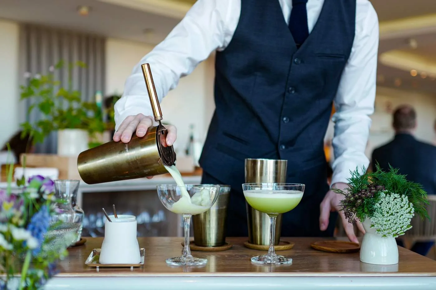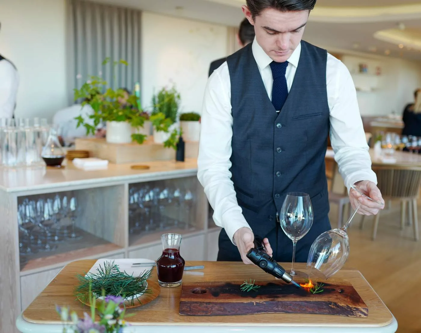 Måltidet er lekent og gøyalt. Rundt oss ristes det cocktails og vinflasker åpnes med et rødglødende jern, slik man korrekt åpner gamle portvinsflasker.