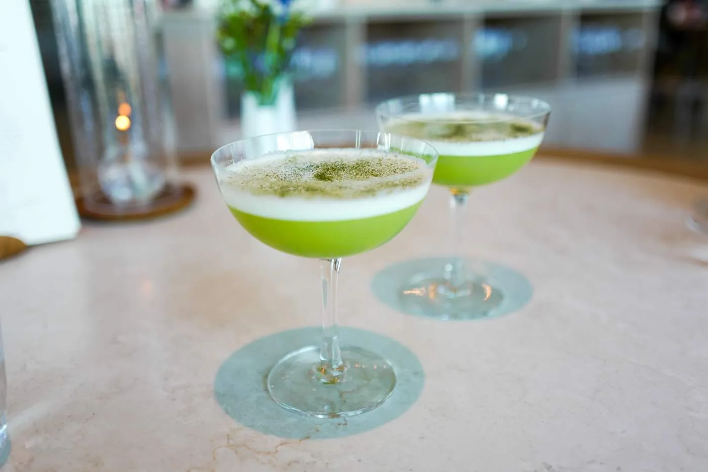 Det shakes en alkoholfri cocktail ved bordet bestående av epler, agurk og dill. Ingen konkurrerende smak av hverken det ene eller det andre, noe som er viktig når man skal balansere en god cocktail. Drinken serveres til de neste to rettene.