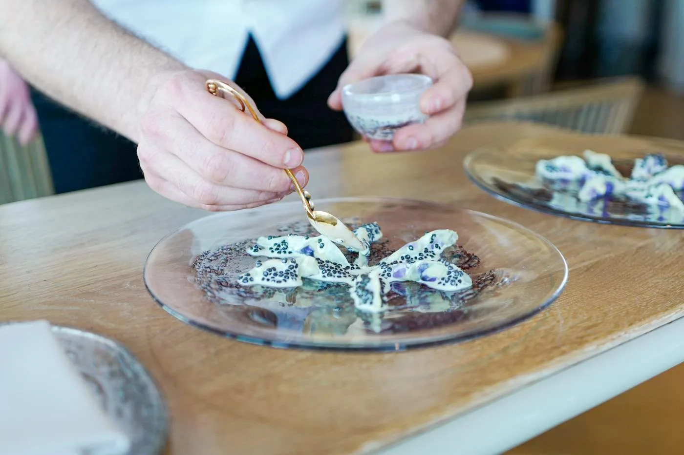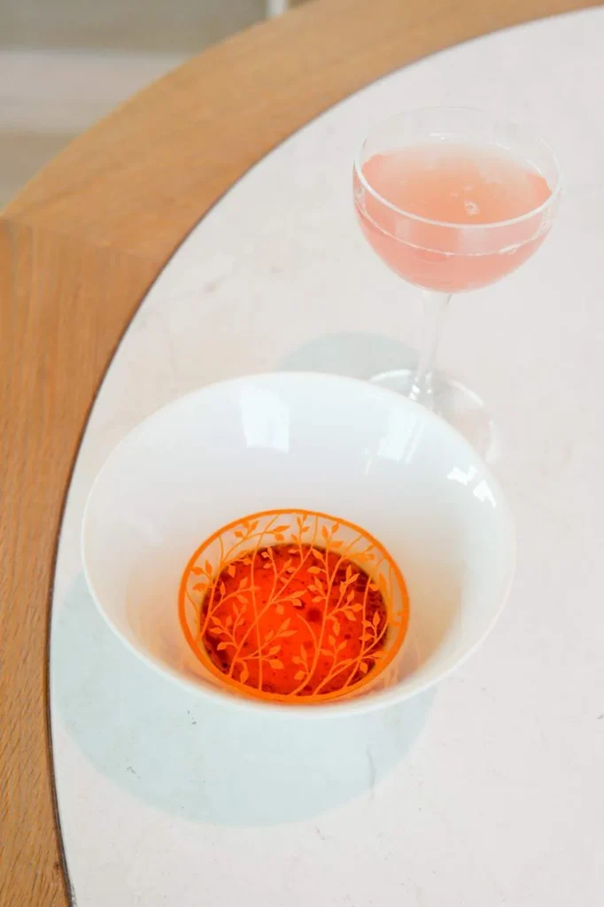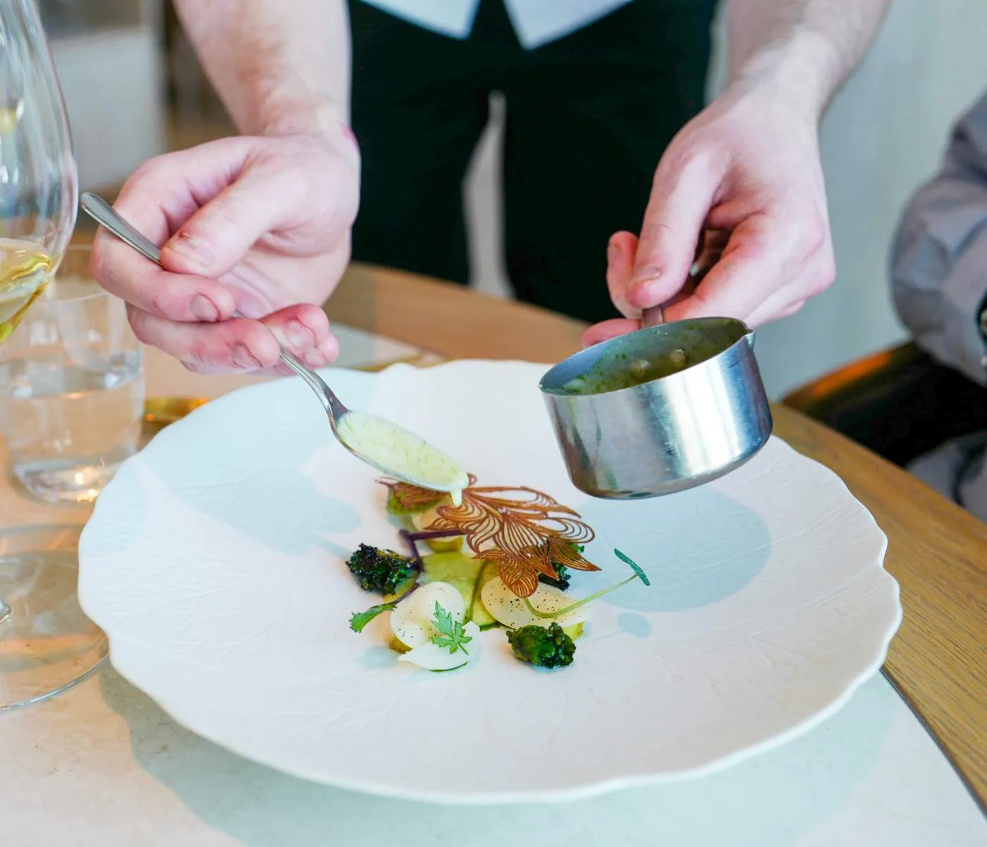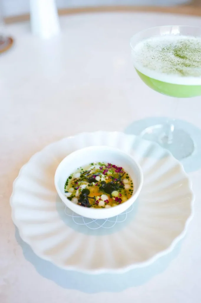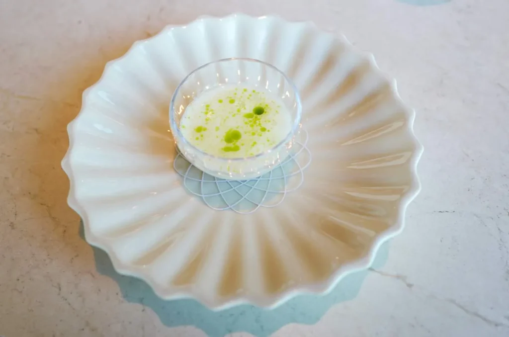 “Havet” er en kald rett laget på agurksaft, østers, hjerteskjell, snegleegg og persille.