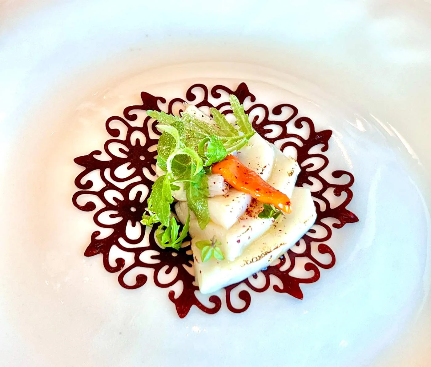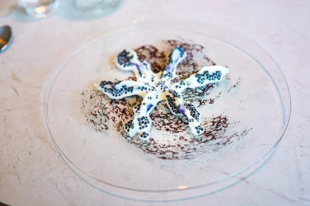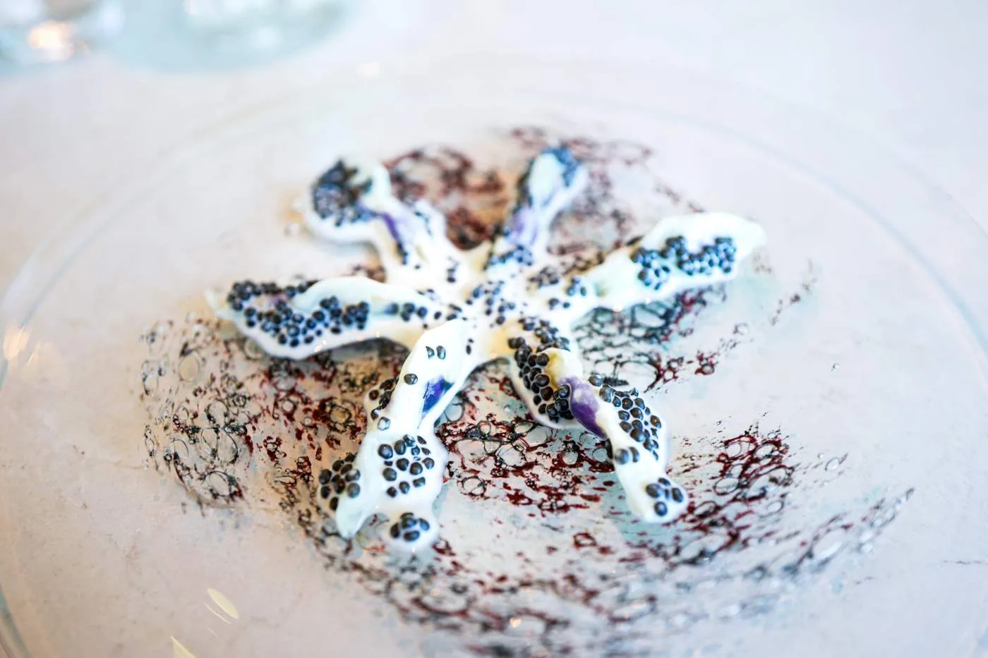 Neste rett vil garantert bli en av de mest fotograferte retter denne sesongen. Den er ikke bare ekstremt vakker, men også en sjelden smaksopplevelse. Små “gyoza” laget av tynne skiver selleri fylt med røkt torskerogn servert med fermentert fløte og kaviar som monteres ved bordet. Retten presenteres på et eksepsjonelt vakkert glassfat som forsterker fornemmelsen av sjøstjerneformen. Når man først bestemmer seg og ville ødelegge den vakre retten er hver munnfull en sann nytelse.