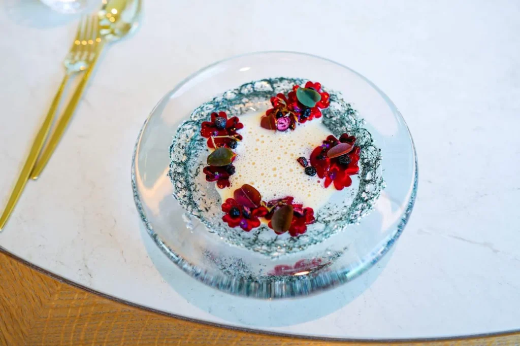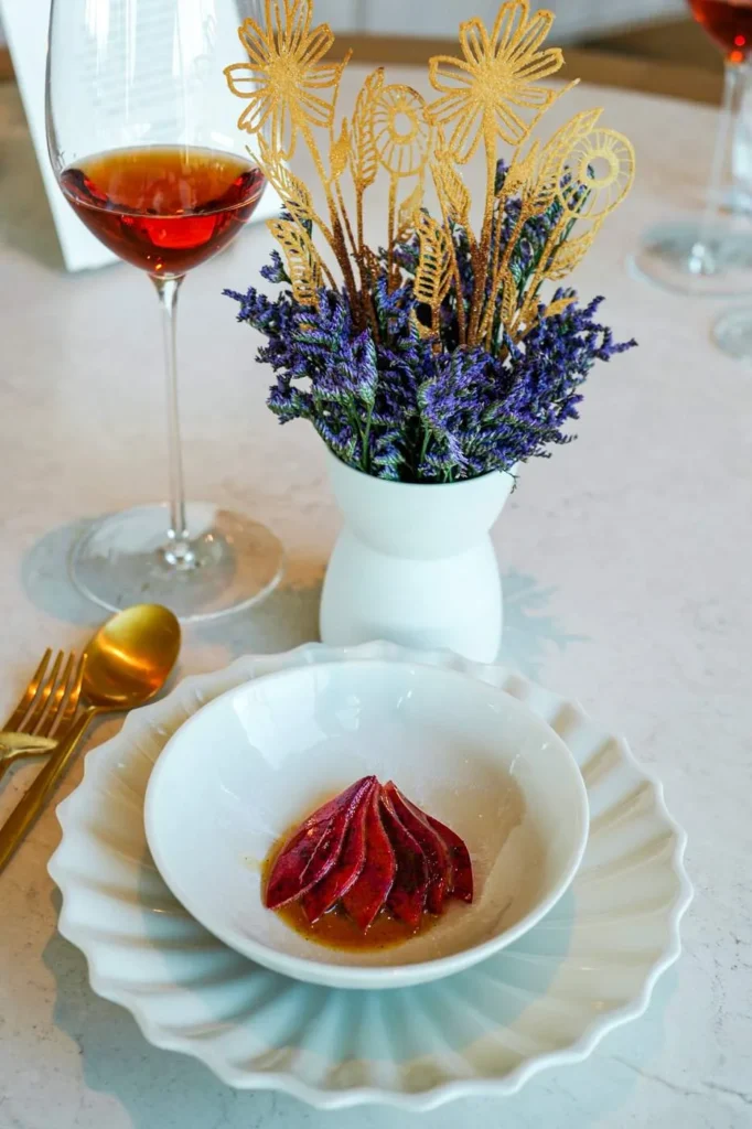 Utseendemessig legger den grunnlaget for neste rett som er en dekadent og svært vakker rose laget av lettsyltede gule beter med tindved, söl og geitost. Inspirert av Solkongen og Versailles og Rasmus’ og hans kones reise til Paris. Gull går igjen i mange av rettene og presentasjonen på den nye menyen på Geranium.