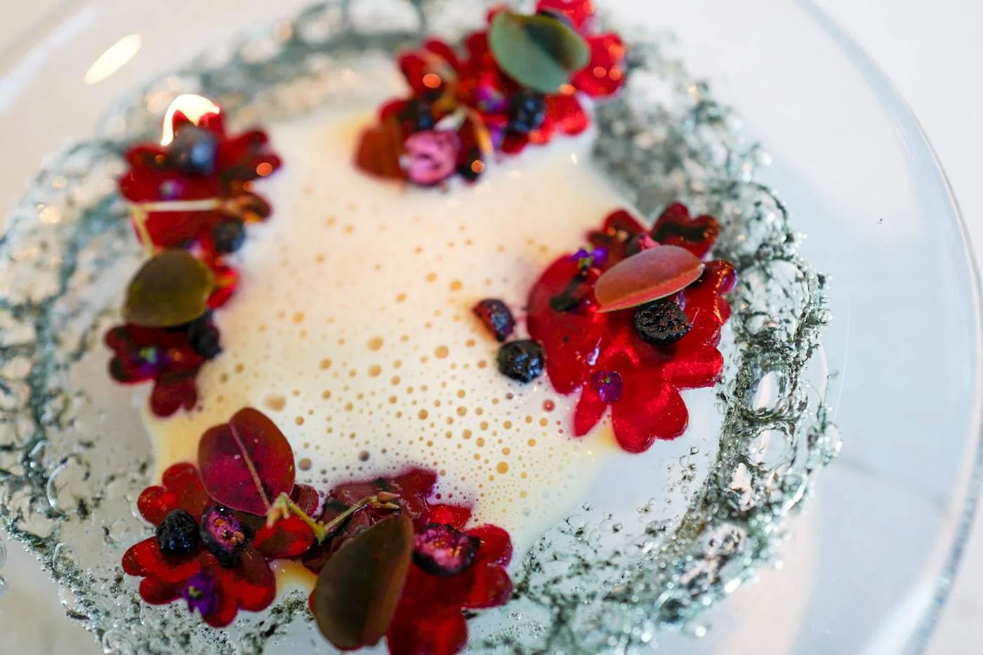 Kokte rødbeter fra Birkemosegården, tørkede blåbær og pepperrot. Neste rett er et syn for gudene. De glassaktige blomsterformede skivene av rødbeter ligger langs kanten på det lekre glassfatet. I midten helles en kremet saus med pepperrot og det jeg tror er blåskjellkraft. Blåbærene på toppen av rødbetene har en seig og konsentrert smak som popper i munnen i møte med pepperroten. De små rødbeteblomstene gir en deilig sødme til de få, men perfekte ingrediensene.