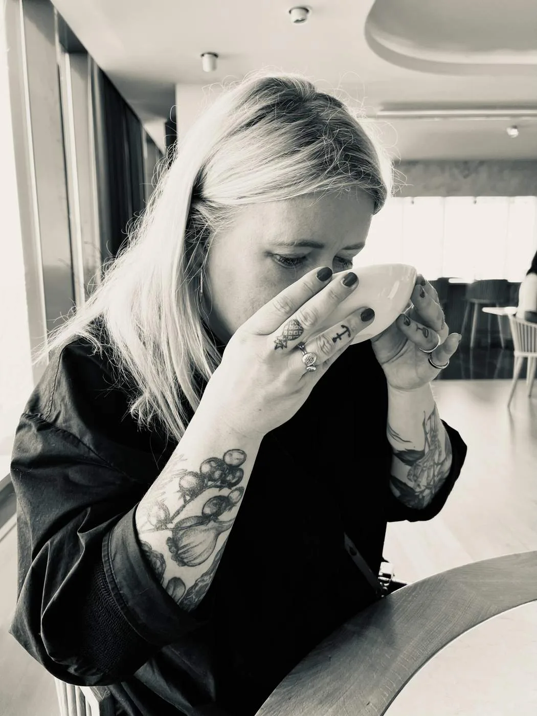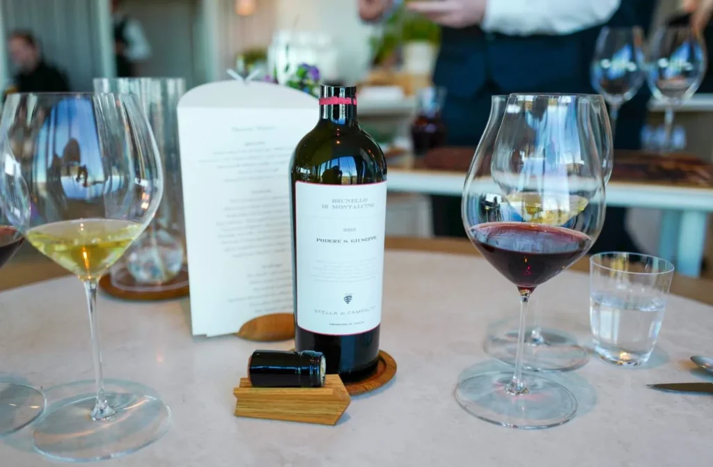 Flasken som ble “halshugget” med det varme jernet serveres nå og det er en 2015 Amore, Brunello di Montalcino fra Stella di Campalto. En eksepsjonell vin med smak av kirsebær og plommer. En ekte meditasjonsvin. Men ikke bare det. Vi får også en alkoholfri cocktail med tyttebær, tørkede kirsebær og infusert av brent gran (som gjøres foran oss). Vi får beskjed om å prøve begge drikkene til de neste to rettene og at det ikke finnes et riktig svar. Det vi liker er det riktige svaret. Uformelt, slik vi liker det.
