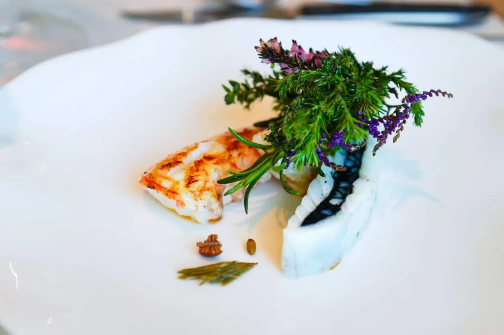 Kokkene kommer inn med et stort brett med fisk- og skalldyrretten. Den består av piggvar og sjøkreps med gran, estragon og aromatiske urter som brennes lett rett før servering for å gi aroma til retten. En liten skål med en deilig kraft helles over før servering. Når man fjerner den dekadente urtekvasten ligger en naken rett på tallerken. Kun perfekt tilberedt protein i form av to av de mest eksklusive og beste sjømaten man kan kjøpe for penger. Her kan man ikke skjule noe, og det er det heller ingen grunn til. Råvarene er tilberedt til perfeksjon.