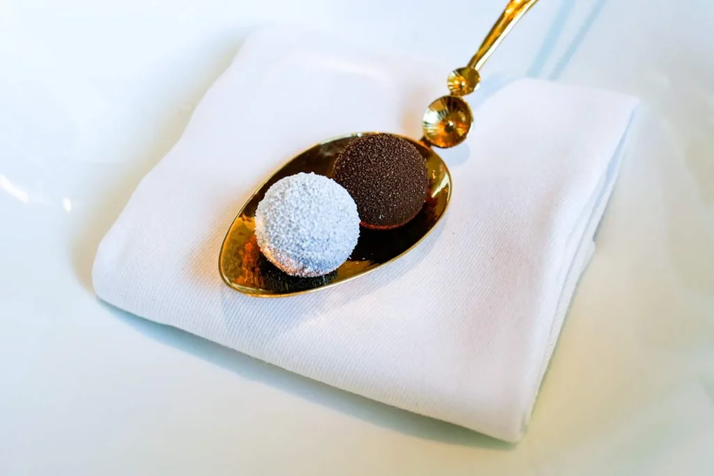 På en hvit pute ligger en gullskje med to matte kuler. En hvit og en mørk brun. For en presentasjon! Så nedstrippet og elegant. Den hvite kulen inneholder en ekstremt konsentrert jordskokksaft. Den mørke inneholder flytende sjokolade. Den første treffer deg som et lite sjokk før sjokoladen som omsvøper juicen gir deg den kremete følelsen du trenger.