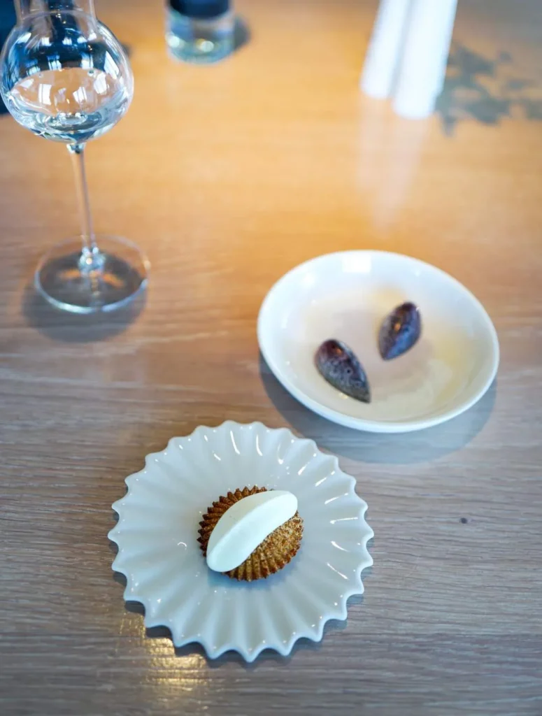Ved første øyekast ser retten korrekt og stram ut, men når vi får vite hvordan den skal spises får vi et smil om munnen. På hver tallerken ligger en nylig mørkerød knipling. På det fat ligger flotte skiver av kamskjell og sitrusurter. En emulsjon av kamskjellrogn ligger i små skåler. Vi får beskjed om å legge kamskjell på kniplingen som er laget av tørket solbær (som et fruktskinn) og brette den sammen som en taco og så dyppe den i emulsjonen. Ah! Jeg kunne spist et dusin av disse. Så morsomt og så godt! Det syrlige solbærskinnet er en deilig kontrast til de søte kamskjellene. Én er altså alt for lite.