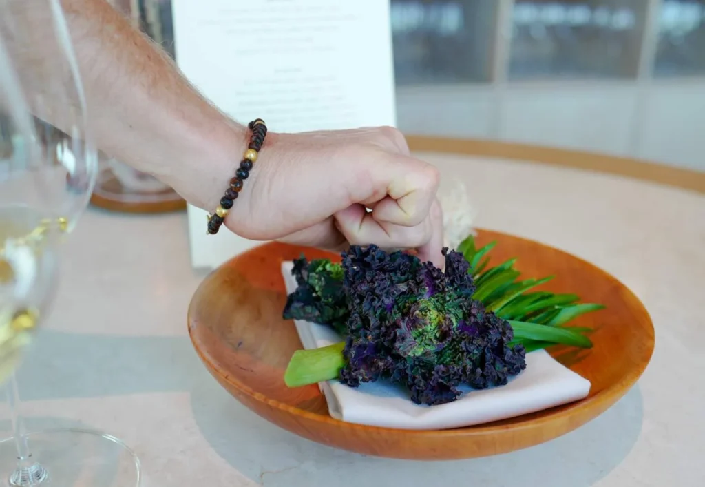 Rasmus kommer tilbake til bordet med et fat med biodynamiske vintergrønnsaker fra Kiselgården. Her ligger rosettkål, purre og villøk i sin naturlige form.