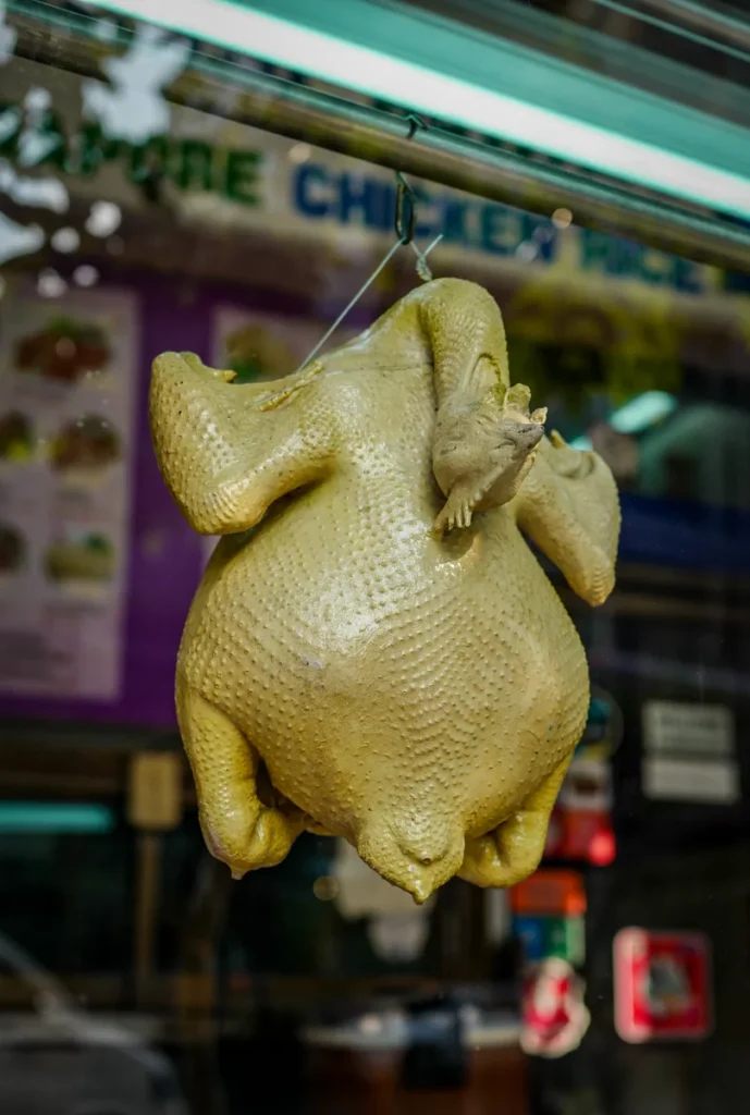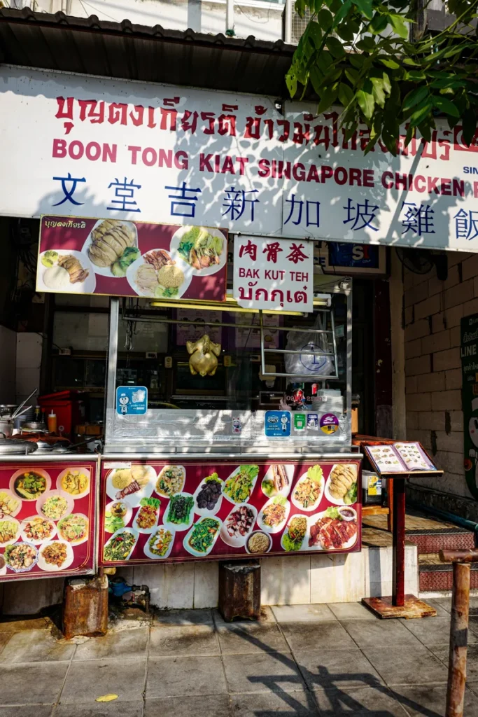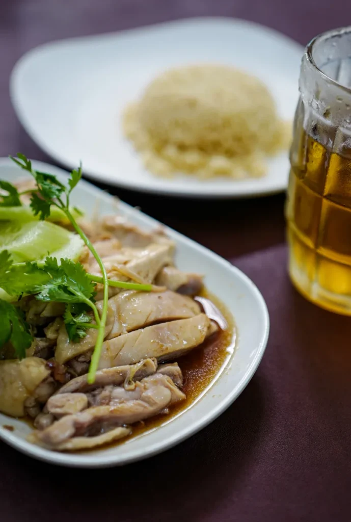 Jeg elsker kylling laget på denne måten. Hainanesisk kylling er populært i Singapore, men også mange steder i Bangkok serverer denne spesialiteten med kokt og saftig kylling som har ligget i en kraft med ingefær og hvitløk. Det er kyllingen og den saftige risen som er stjerna og så tilsetter du smak fra kondementene som står på bordet.