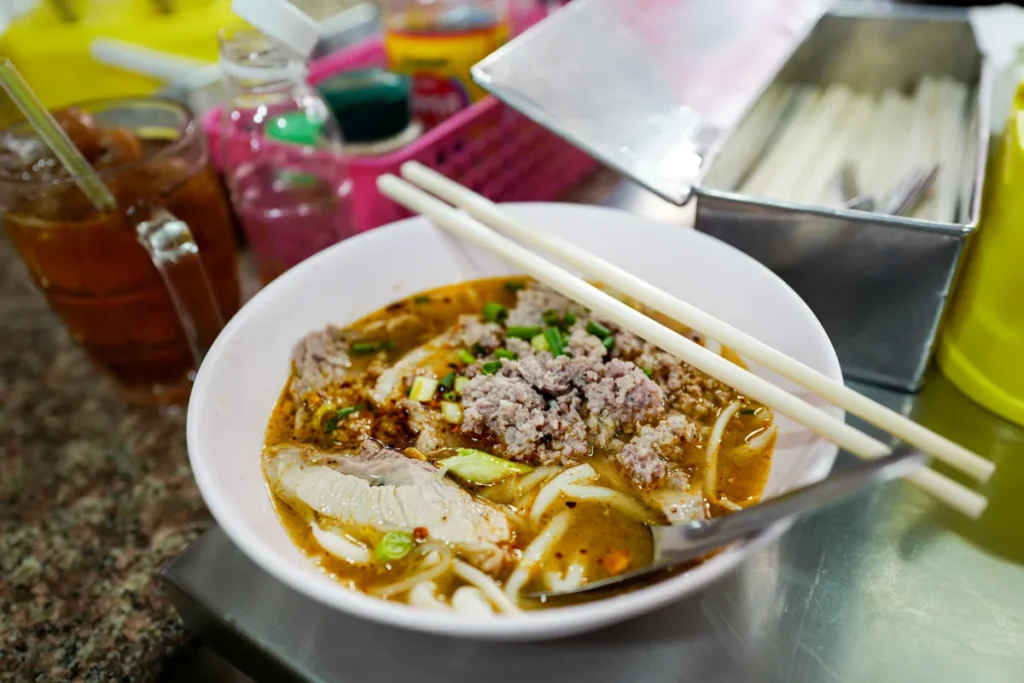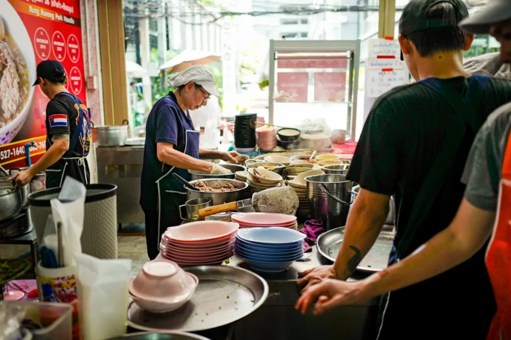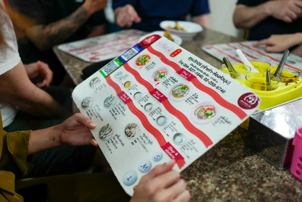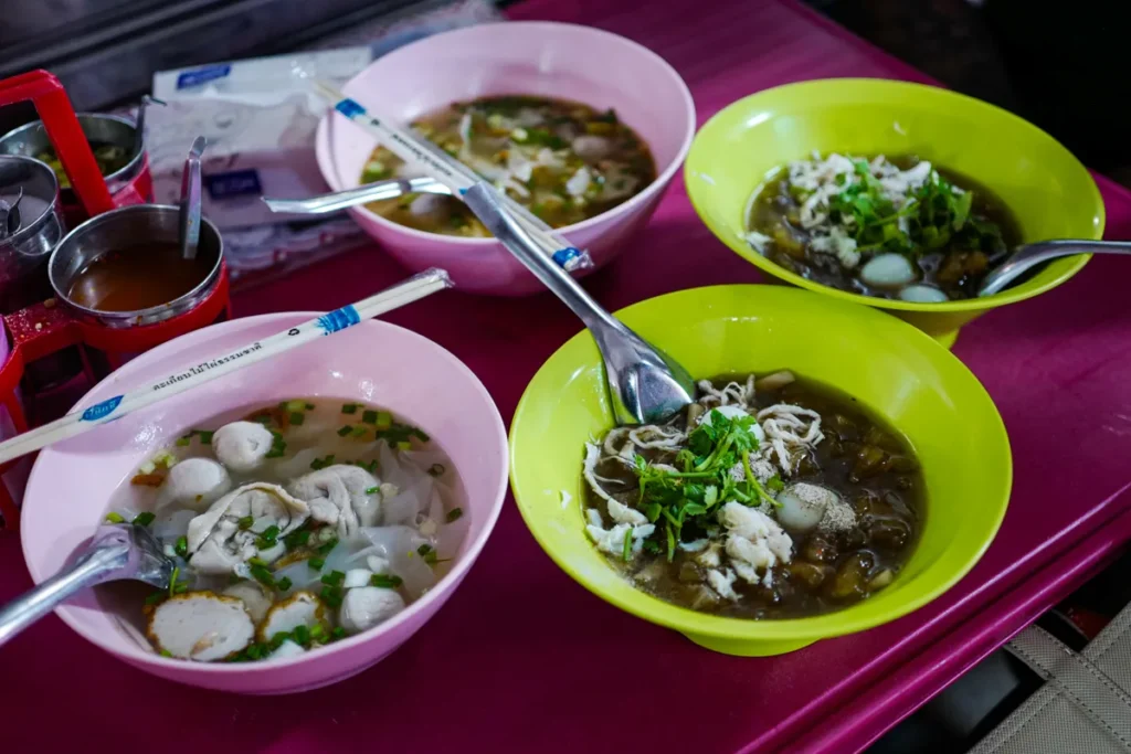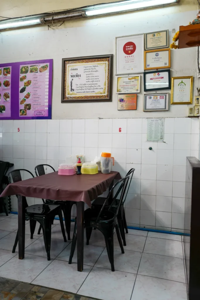 Du kan spise frokost her for de åpner klokken 08:00. De stenger klokken 17:00. Det populære stedet ligger ikke langt fra Emporium shoppingsenter. Restauranten er enkel og det er ikke mange retter på menyen, men Oh Lord, så fantastisk det smaker! Du velger hvilken suppe du skal ha, så hvilke nudler og til slutt hvilket protein. Og du bestemmer også selv styrken og størrelse. Det smaker vidunderlig. Nærende, mettende og 100 % thai. Å spise varm suppe i varmen er faktisk veldig deilig. Jeg spiste medium bolle med tom yam, korte nudler, svinekjøtt (både kjøttdeig og skiver) i sterk variant. Perfekt.