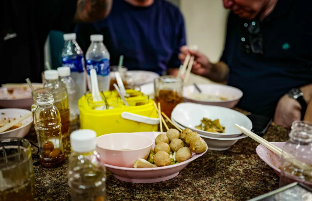 Jeg har spist diverse steder i Chinatown tidligere og denne gang tok chef Deepanker Khosla fra Haōma oss med til en av de små gaterestaurantene som han liker. De serverer supper med nudler og fiskeprodukter. Jeg spurte ham om det var trygt hygienisk sett å spise hvor som helst på gata, og han svarte at det er ganske godt kontrollert hva angår hygiene. Det er chilien du skal passe deg for. For mye av de små og sinte kan gjøre sitt til at du må bli på rommet dagen etter.