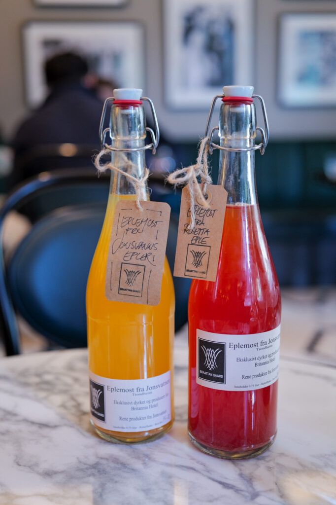 Det står ikke på god drikke på menyen, og et tips til deg er å prøve en av eplemostene som kommer fra Britannias egen gård på Jonsvantnet som heter Braattan gård.