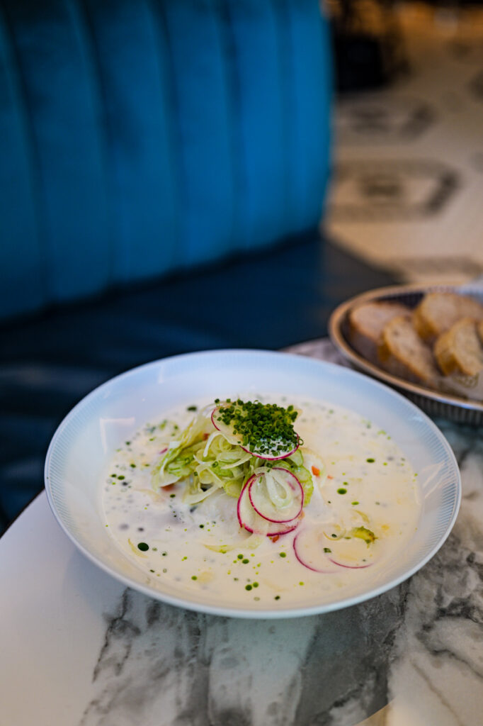 Jeg skal forklare. Inn kommer en dyp tallerken med flotte stykker av hvit og rød fisk og urteolje i bunnen. Flotte tynnkuttede grønnsaker som fennikel og gulrot ligger på toppen. Håndpillede reker er også representert. Så kommer kokken inn med en sølvkanne og heller varm, kremet fiskesuppe over. Til suppen får du surdeigsbrød. Porsjonen er raus, om ikke gigantisk. Suppen er ikke for tung eller fet. Det er rett og slett perfeksjon.