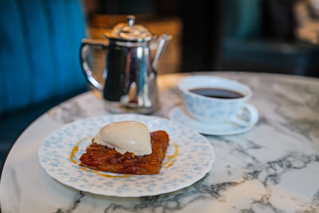 Jeg slipper ikke unna desserten. Og hvorfor skulle man? Lun Tarte Tartin med vaniljeiskrem på toppen er så fransk som man kan få det. Bakverket er syltynt og eplene lekkert karamellisert.