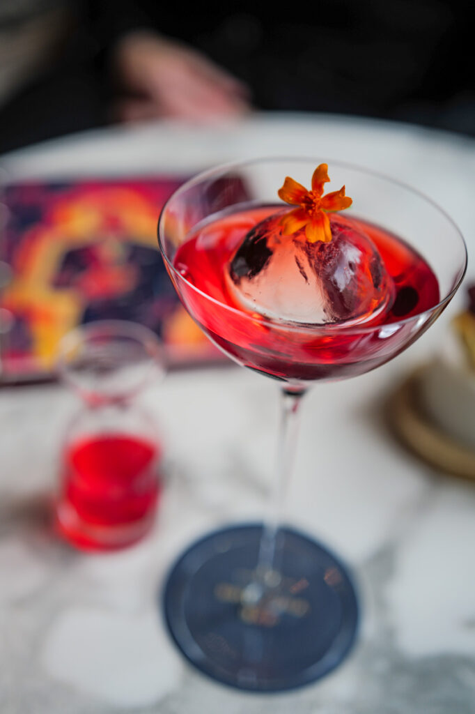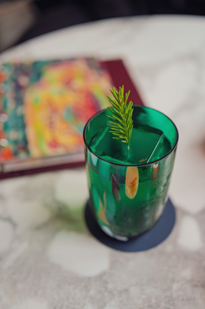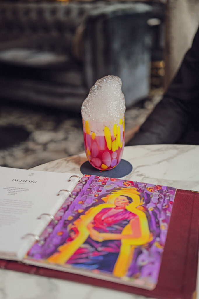Cocktailene presenteres i en “bok” med 3D-kunsttrykk laget av Øyvind. Foruten «Portretter»-menyen kan du få klassiske cocktails, vin og småretter.