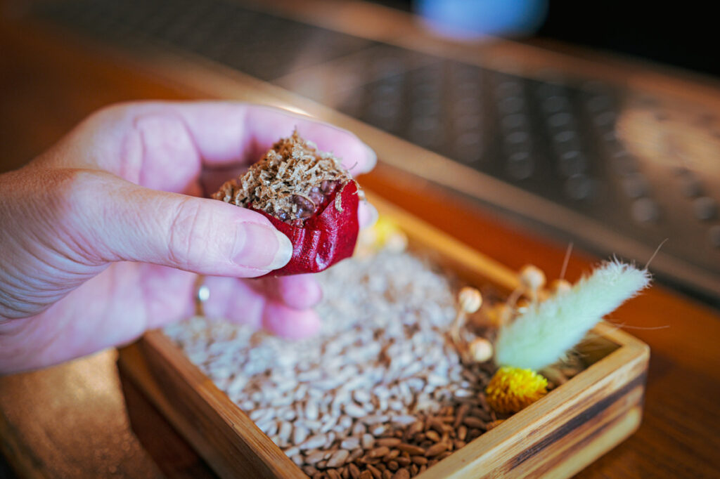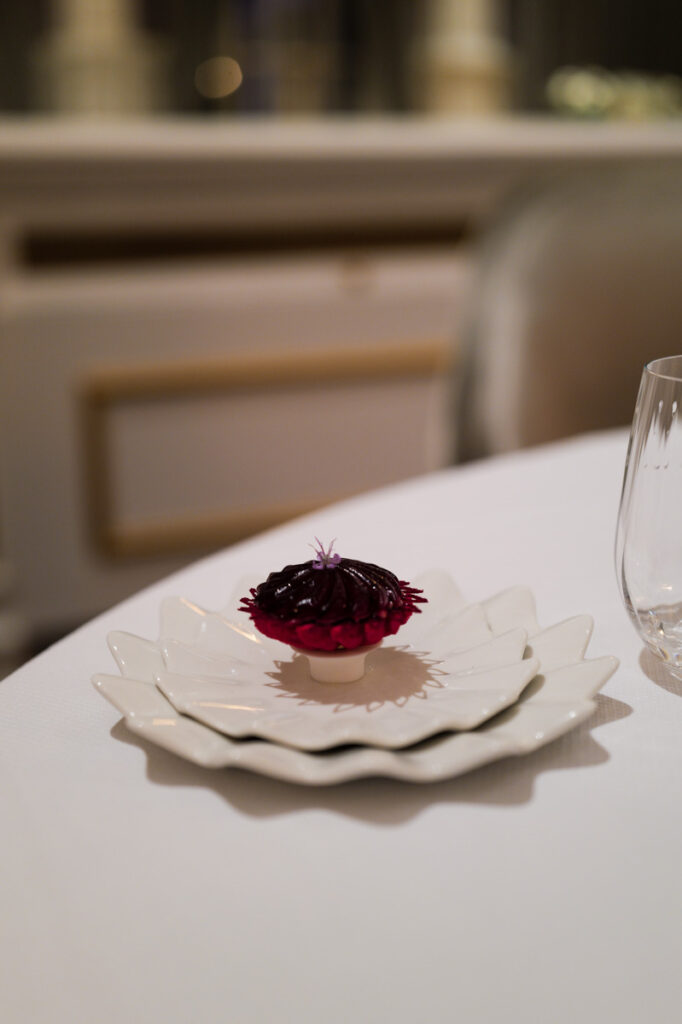 Første snack er en kombinasjon av to verdener: Rødbeter og reinsdyr. Rødbeter fra Frosta lages til en læraktig konsistens før det friteres til små skåler. Majones på syltet grønn pepper, rødbeter og reinsdyr fra Røros vendes med ristet sort pepper og brunet smør. På toppen ligger et lass med revet sort trøffel. Kombinasjon av råvarene er nydelig og trøffelen er selvsagt med på å løfte helhetsinntrykket.