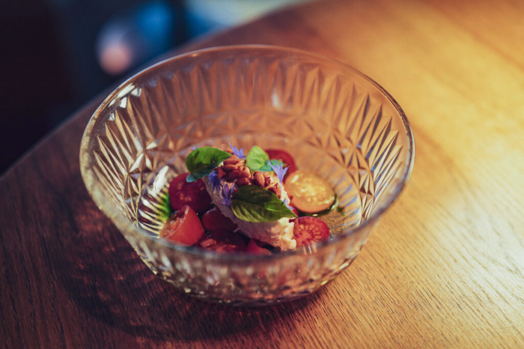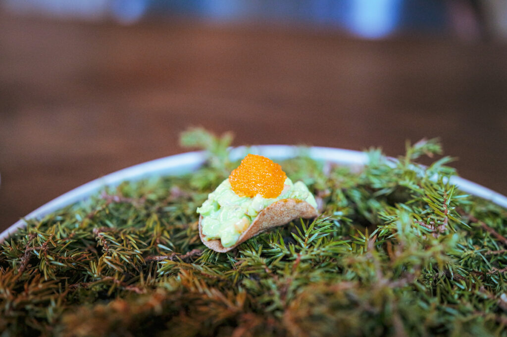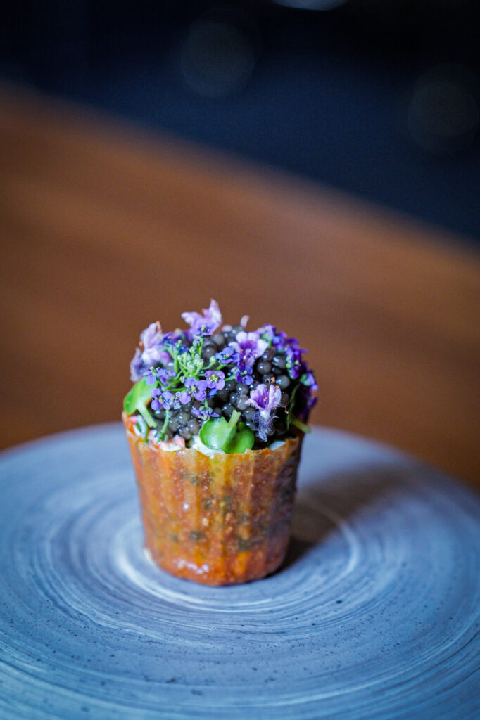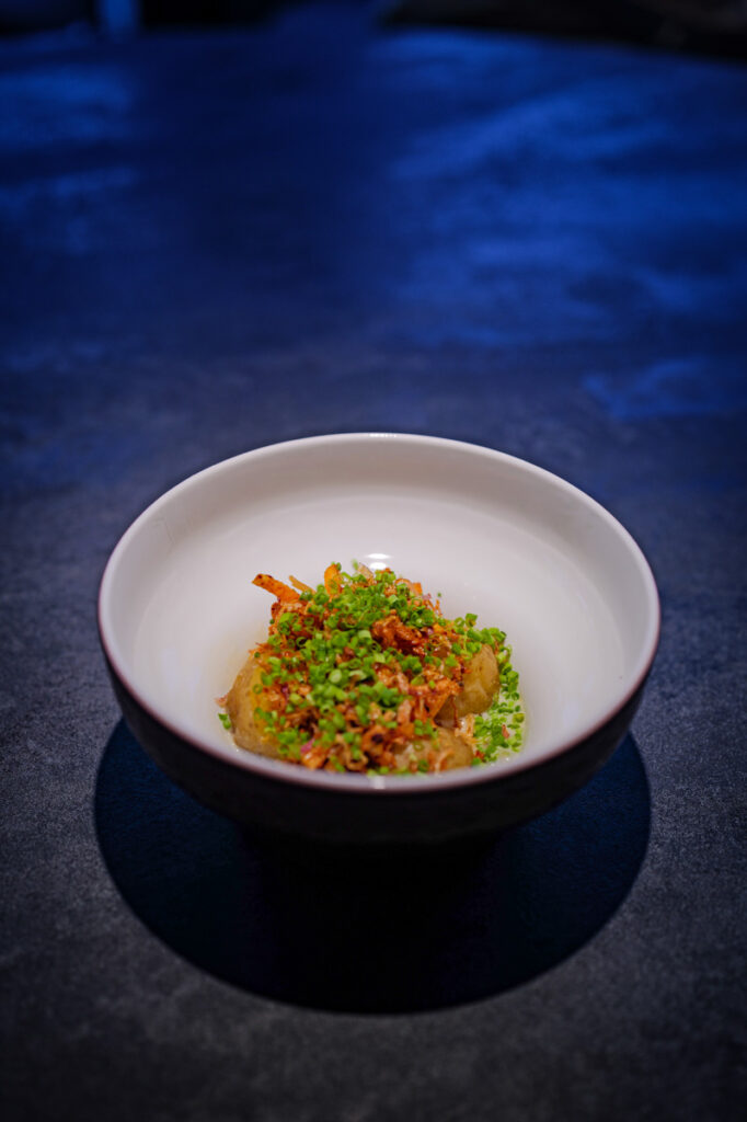 Terten er fylt med kongekrabbe fra Varanger som er trukket i smør og smaksatt med fermentert sitron og verbena og toppet med en krem av fennikel glasert i kongekrabbekraft. Komboen krabbe og verbena var helt ny for meg, og med kallenavnet «krabbekvinnen» kan du bare forestille deg hvor god jeg synes denne snacksen smakte.