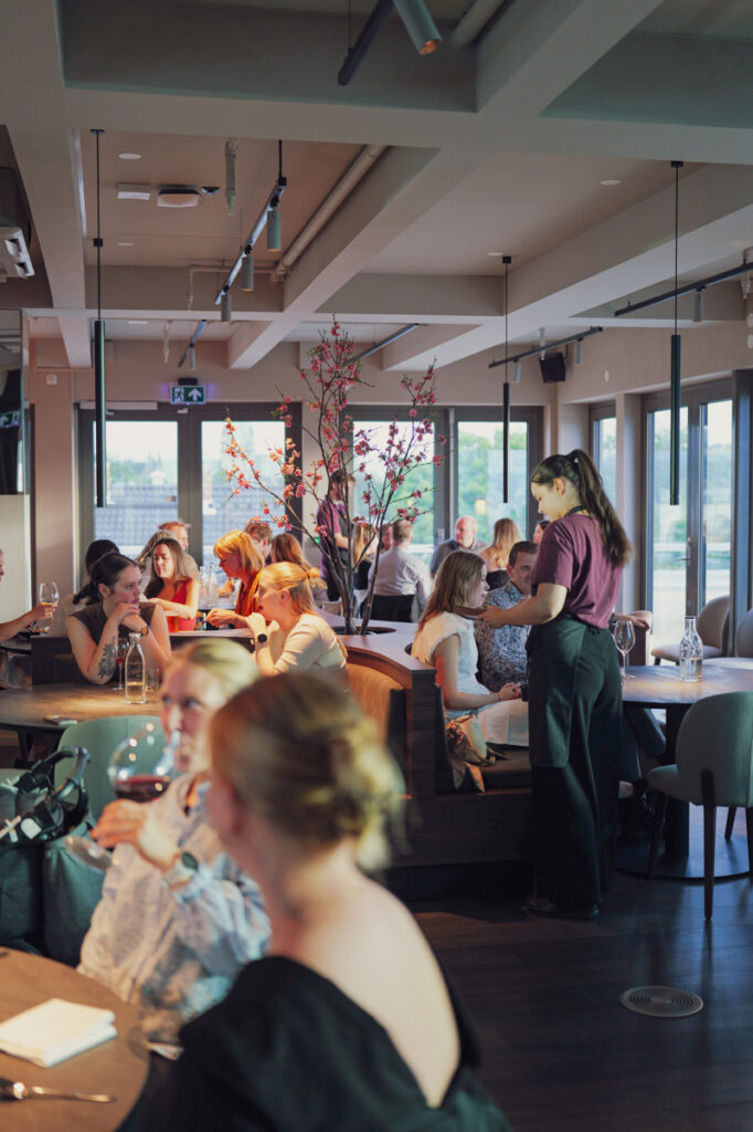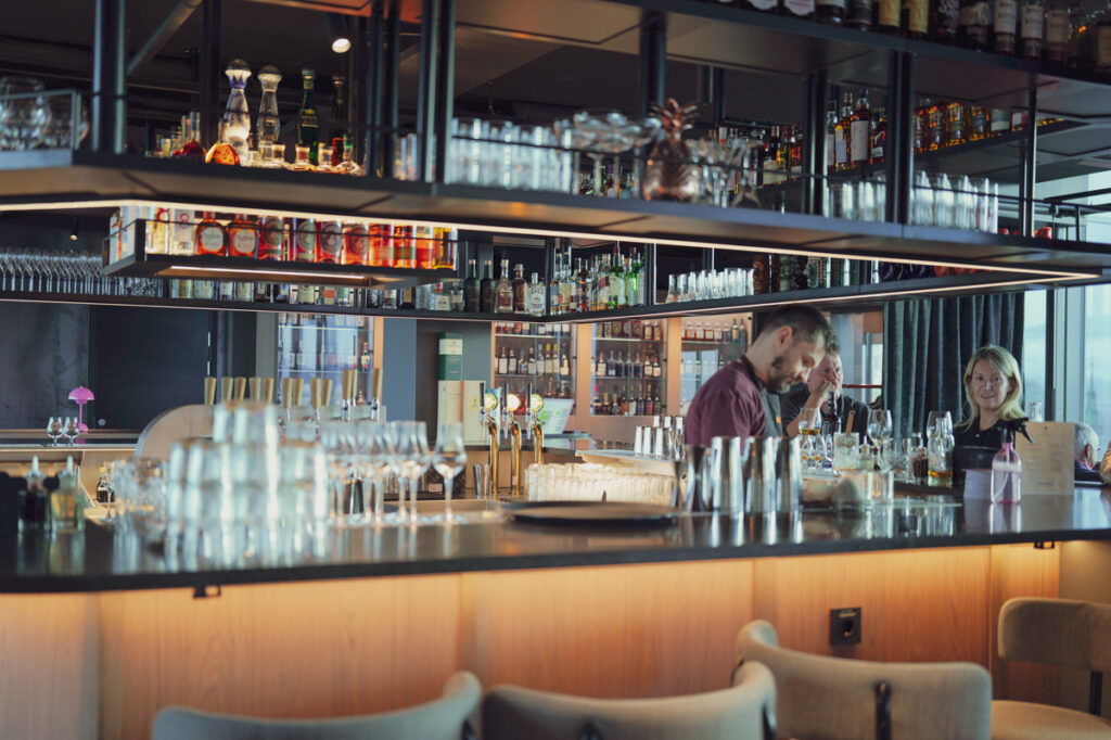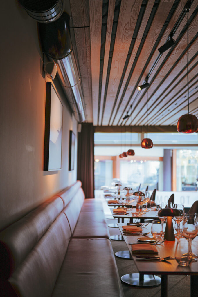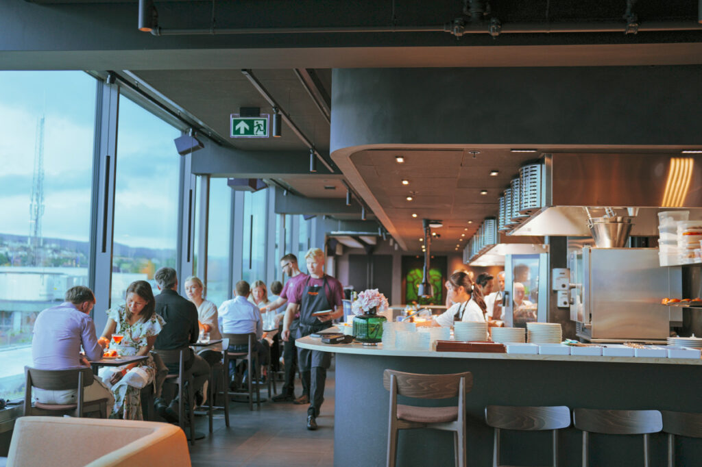 Du ankommer med heisen og det første du ser er et stort og velutstyrt barområde. Før du kommer til restaurantdelen går du forbi en åpen kjøkkenløsning med vedovn så varm at den tilbereder et stykke fisk på under et halvt minutt.