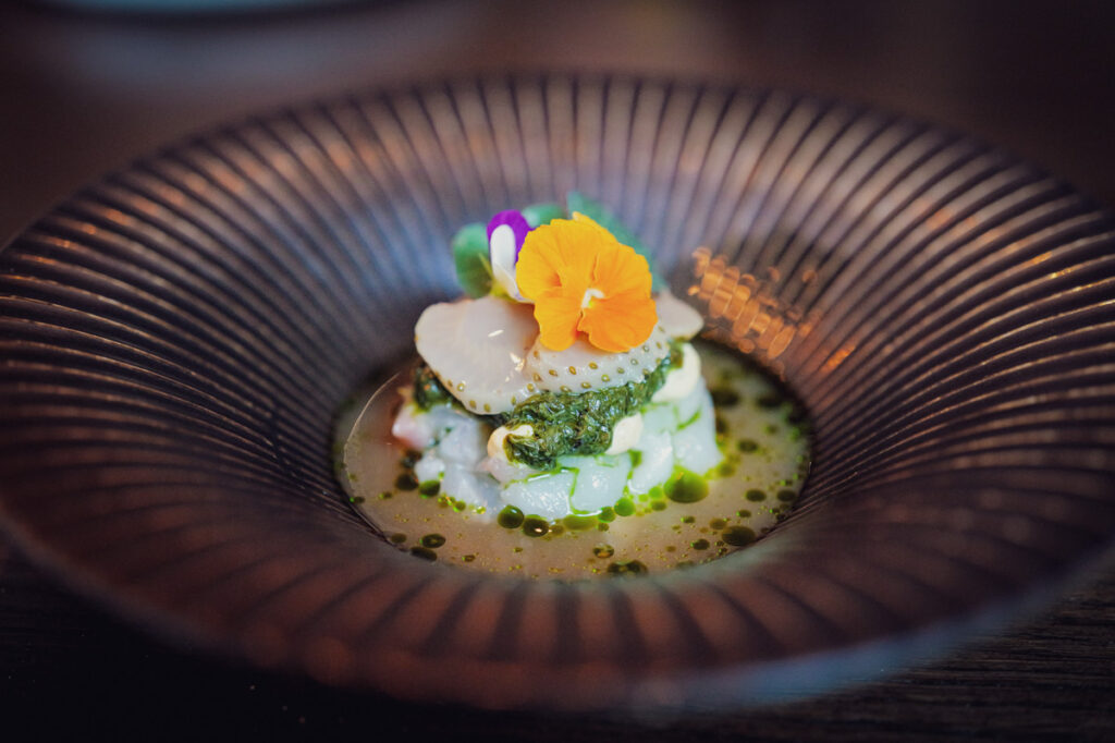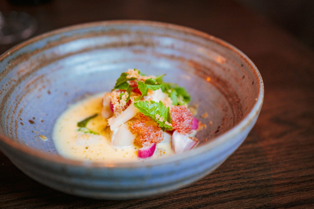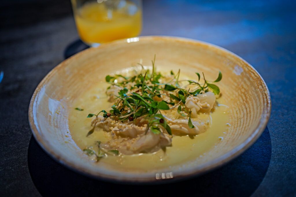 Den kalde fiskeretten som kommer etter at jeg har proppet i meg litt av det deilige surdeigsbrødet, er som en norsk ceviche med tørrmodnet Sterlingkveite, blåskjell og fermentert gulrot. Skiver av grønne jordbær gir både syre og sødme til denne friske fiskeretten som jeg virkelig elsker.
