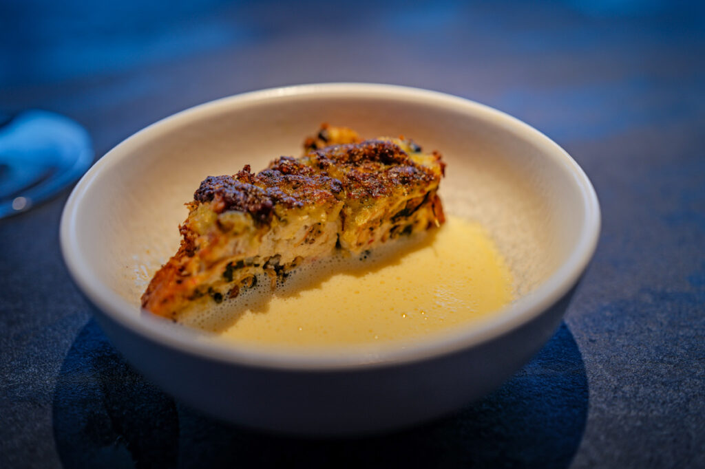 Rett nummer to er en syltynn crustade laget på redusert pilsnerøl proppfull av kjøtt fra sjøkrepsklør og bittelitt sitronsaft og majones laget med ‘nduja. Toppet med caviar fra GastoUnika. Helgetun forteller at han bruker caviar fordi det smaker deilig, men også for teksturen og mengde pønsj det gir til en rett.