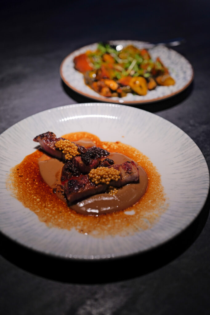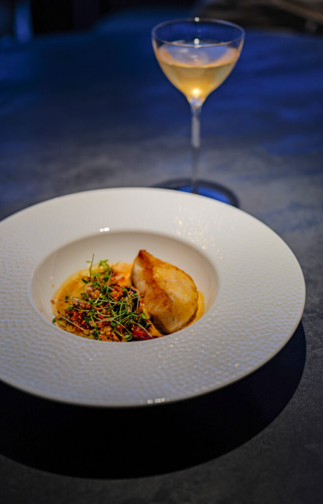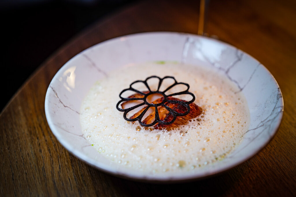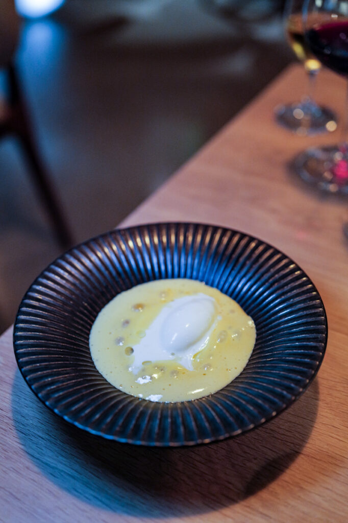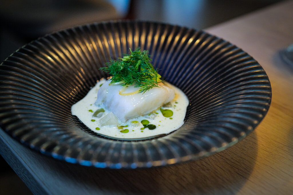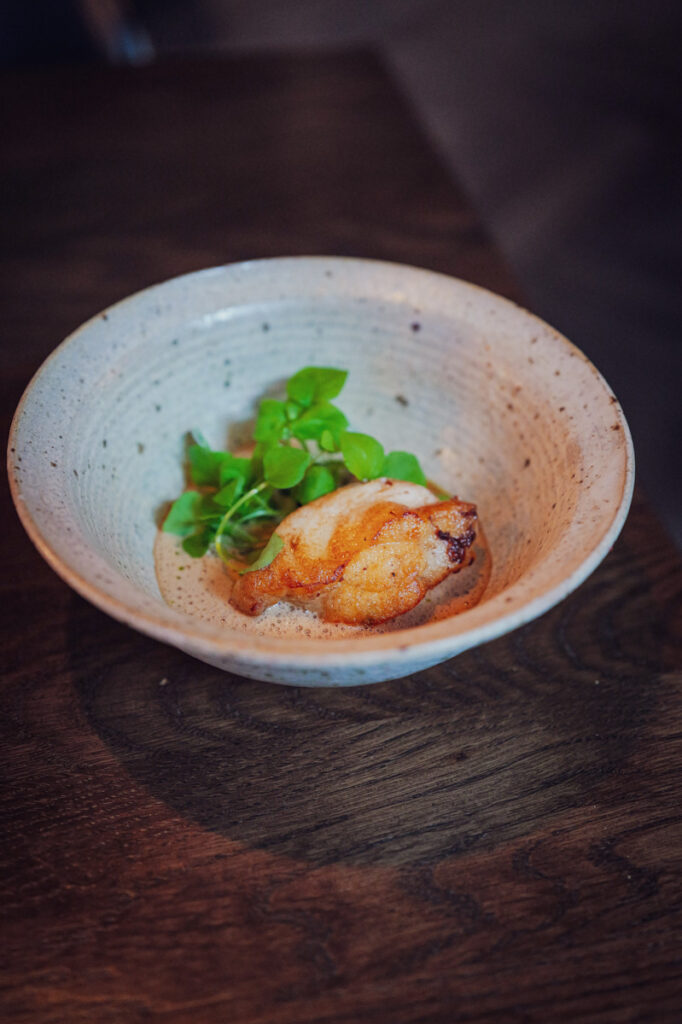 Det er også plass til en varm fiskerett på menyen og det er breiflabb fra Ila Fiskemottak som er neste rett. Delikat stekt og servert i en kremet sjøkrepssaus. Men det som gjør retten er de grillede ertene. Pow! Så mye smak det er i dem. Kun en gang tidligere har jeg smakt grillede erter og det var hos Dabiz Muños på DiverXo i Madrid. Retten som inneholdt dette elementet var min favorittrett i 2024.