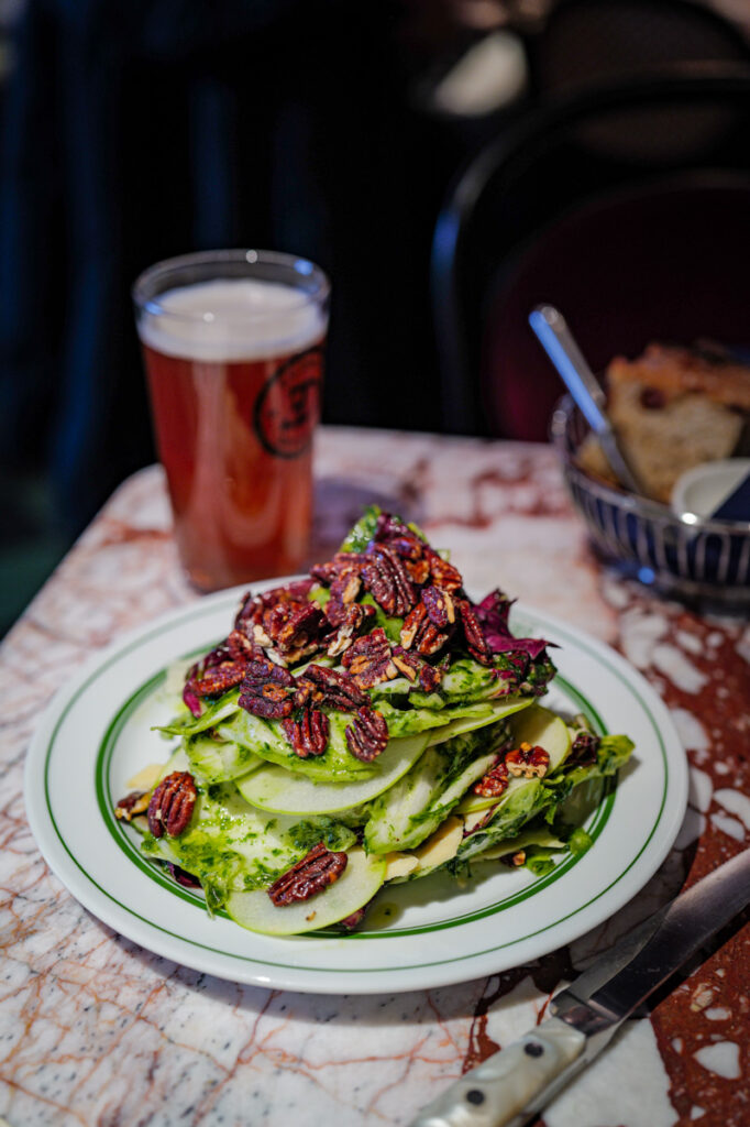 Salaten jeg beskriver en en lagvis salat (som en lasagna, som Gjermund sier) med diverse salattyper perfekt vendt i dressing slik at alle kriker og kroker er dekket. Det er skiver av selleri, eple, fennikel, vellaget gouda og et lass med kandiserte pekannøtter. Og den serveres med en svær biffkniv til å skjære gjennom alle lag. Perfekt til å dele. Jeg vil anbefale å gå sammen og bestille flere retter og dele dem slik at man får smakt på mest mulig.