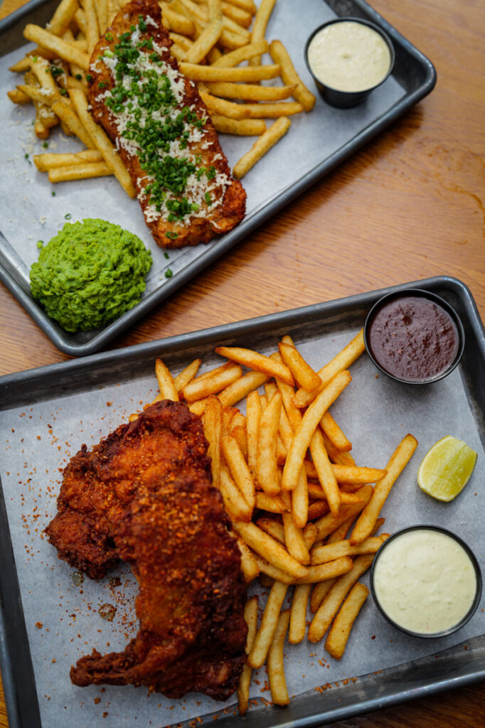 Fiskefileten er perfekt skåret til og dekker den sprø poteten som om det skulle være en nigiri.
