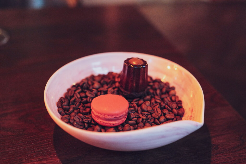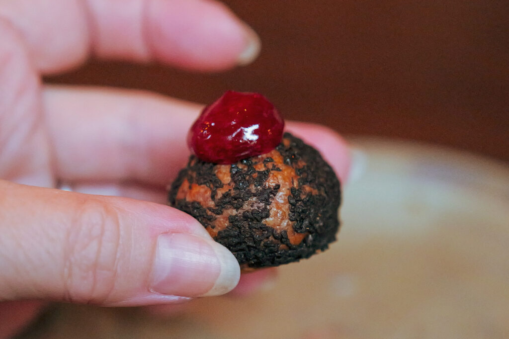 Siste rett er også en smaksbombe av kanskje de beste smakskombinasjonene man kan ha: kyllinglever og kirsebær. En kreativ salt og syrlig makron der selve makronen er laget av kirsebær fylles med madeira og sprøtt kyllingskinn og kyllingleverkrem glasert med kirsebærsirup på toppen.
