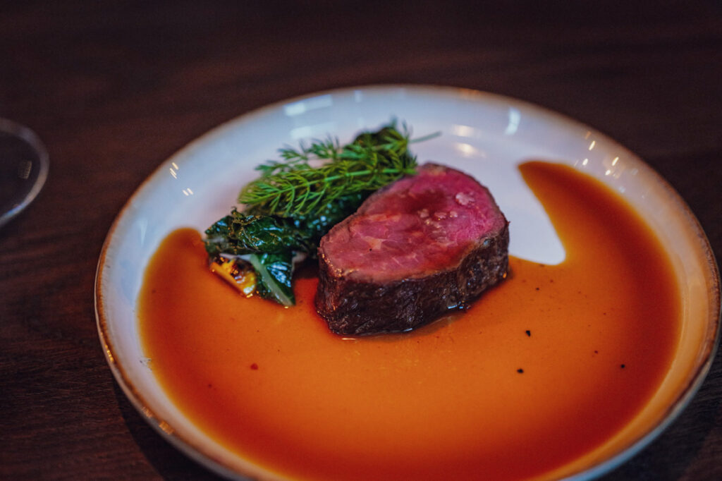 Vi skal innom en kjøttrett, som i dette tilfelle er et stykke tørrmodnet ytrefilet av okse fra Røros med squash og grillet kål, før melkeis laget med spansk kjørvel med verbenaolje, ripsgranité og yoghurtskum kommer på bordet. En frisk smak av norsk sommer. Til kaffen får jeg makron med bringebærsjokolade og canelé med salt karamell med mjødurt. Nok en gang klarer Saga å imponere meg både når det kommer til mat og drikke. Dessuten synes jeg lokalet er særdeles behagelig og servicen likeså.